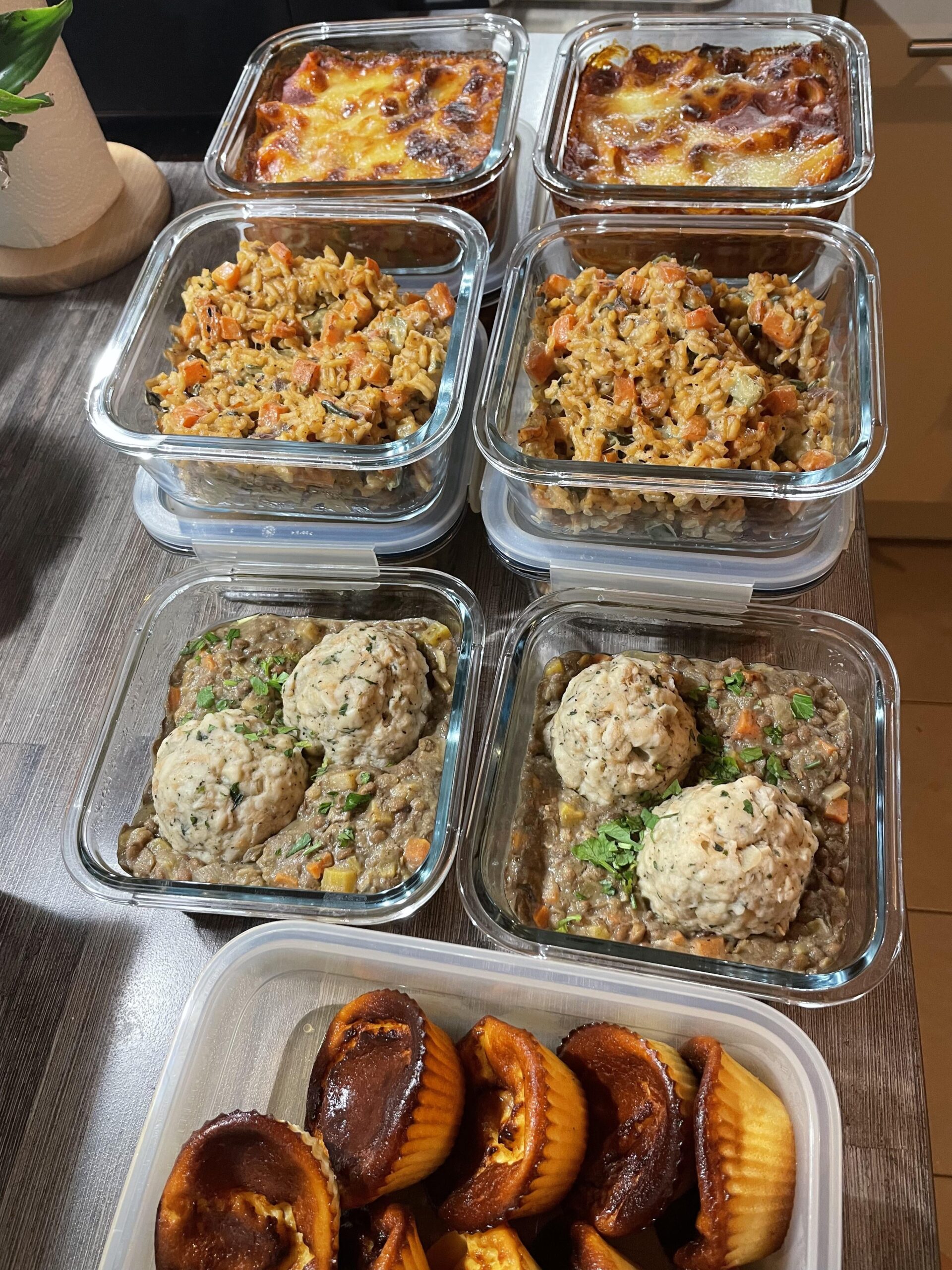 *bread dumplings with lentils (for bread dumplings: bread cubes, onion, oil, soy milk, parsley, salt, nutmeg | for lentils: onion, root vegetables, lentils, parsley, seasonings)