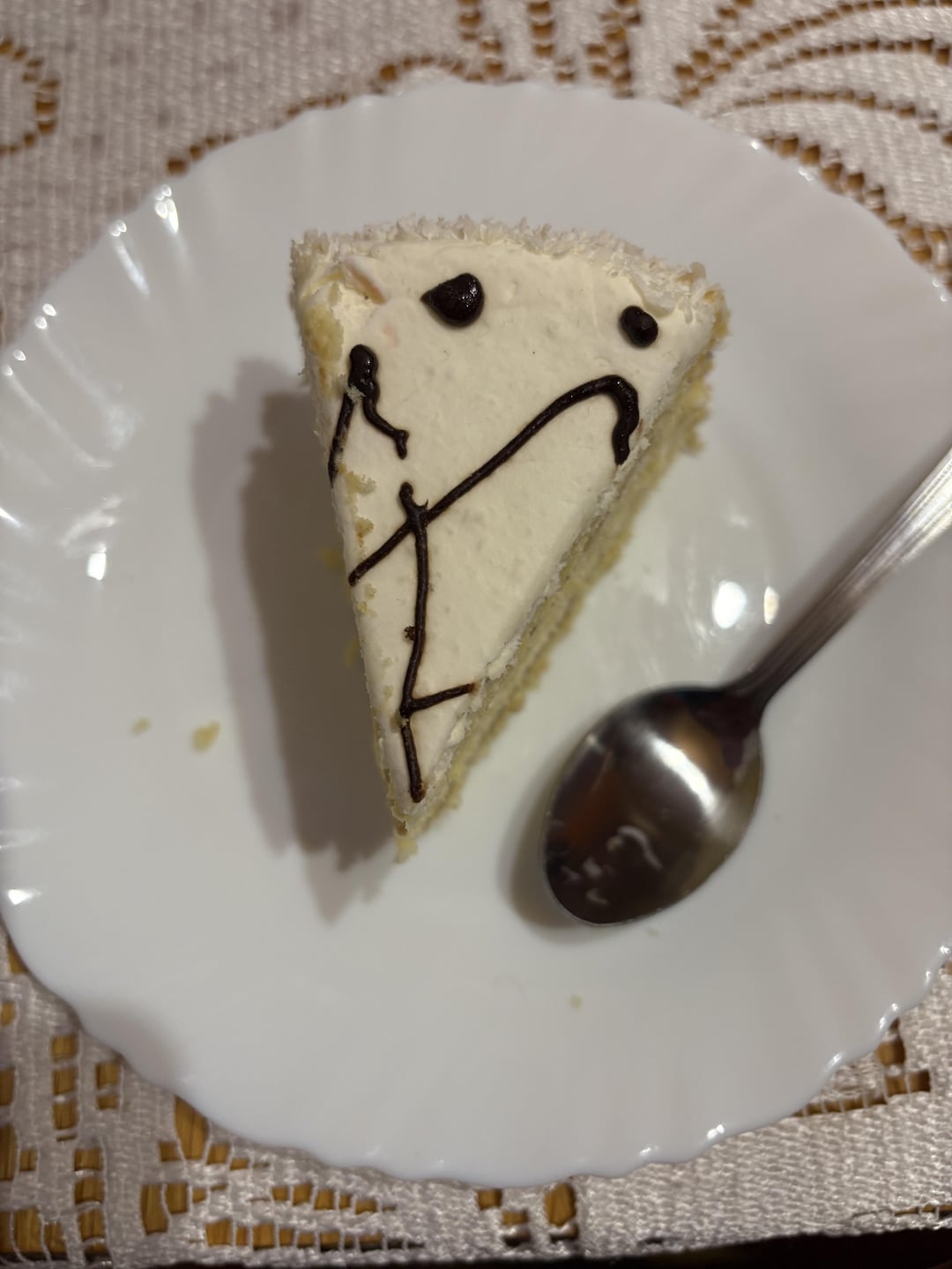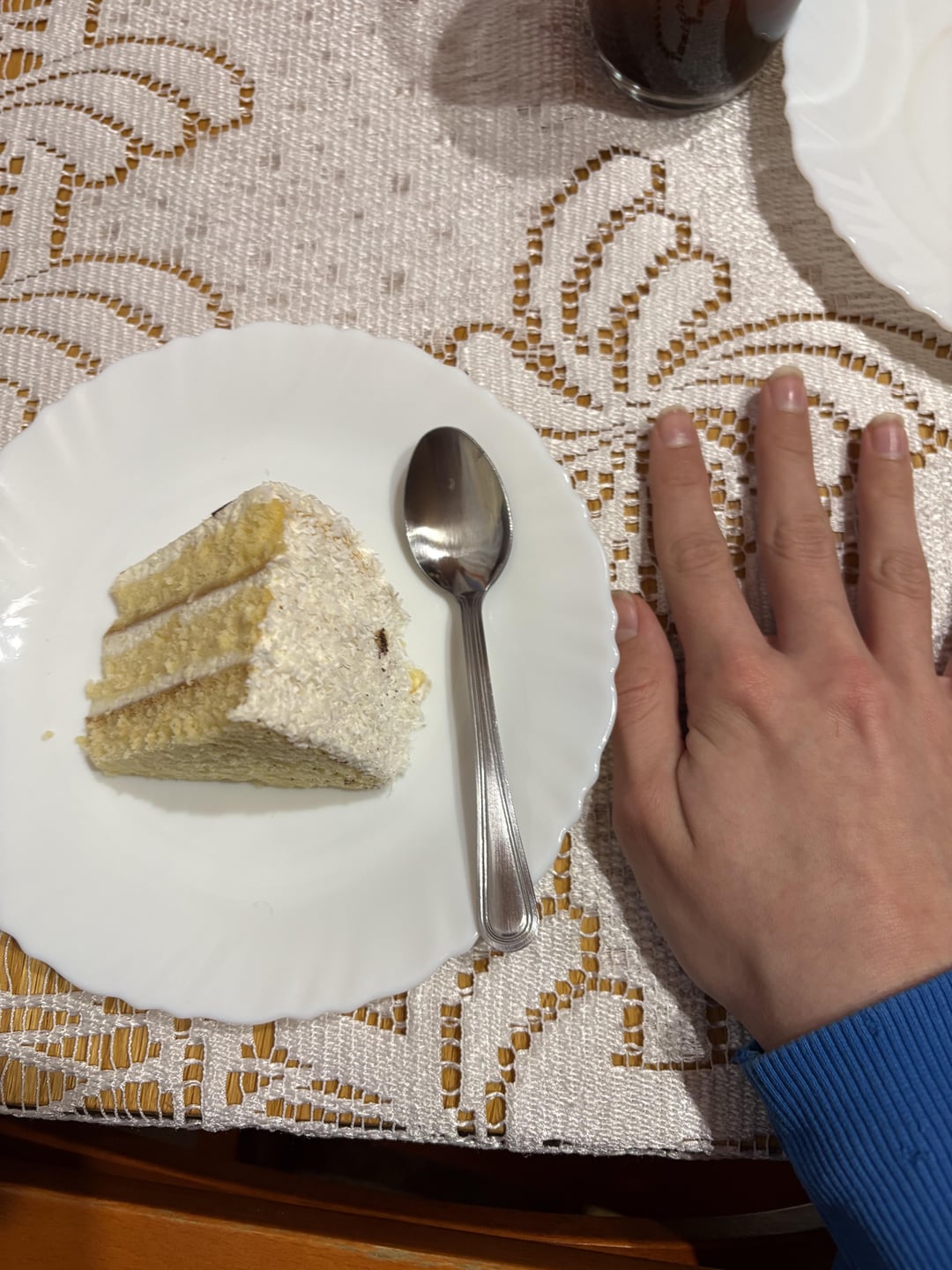im not sure the flavour but it has coconut flakes on the edge and tastes nutty, the slice is pretty small like the cake itself (hand and teaspoon for comparison)