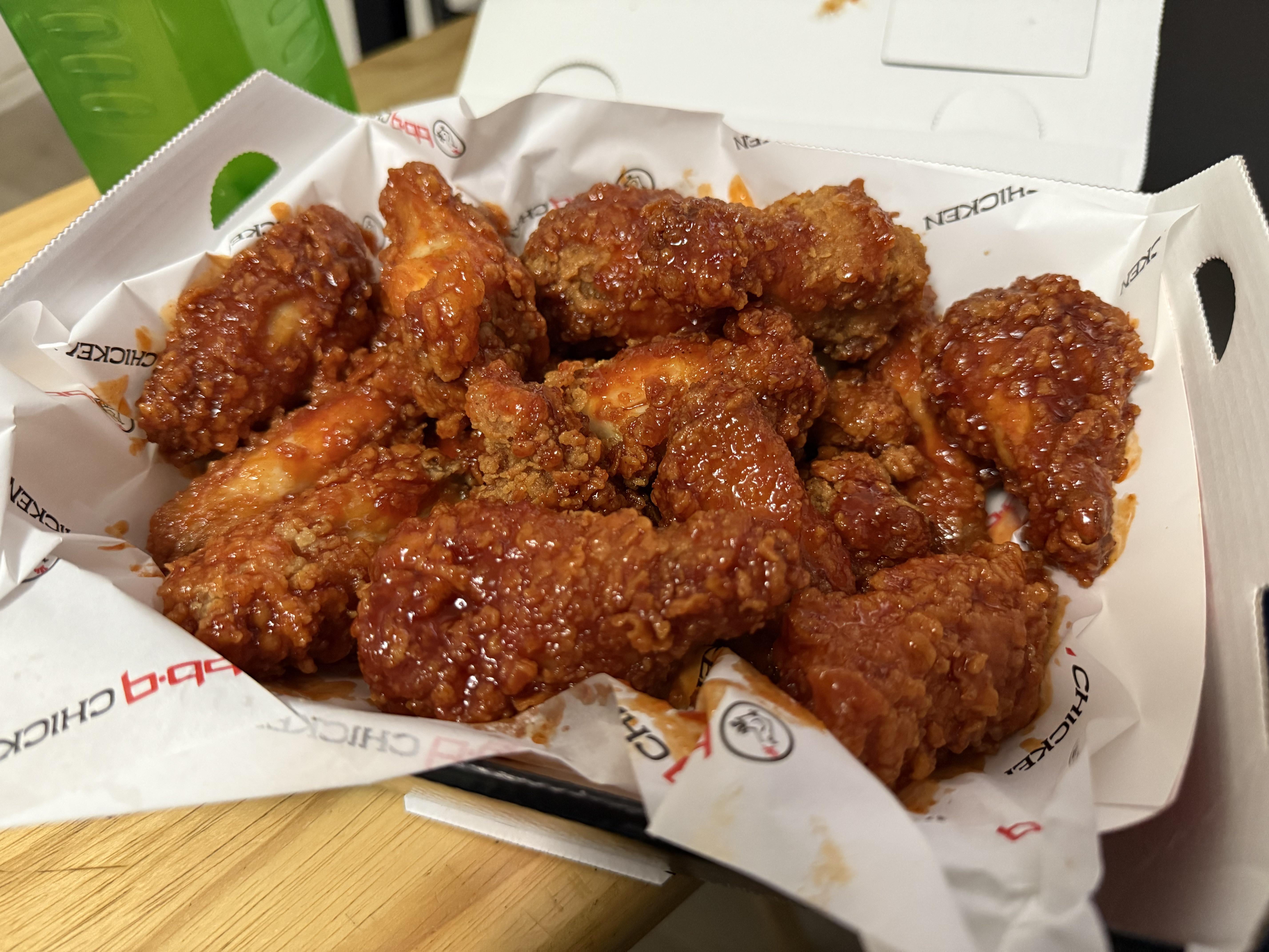 bb.q chicken is a korean fried chicken chain that’s pretty popular where I live, highly recommend it the one I usually get is called “wings of fire” (it’s also the one in this pic)
