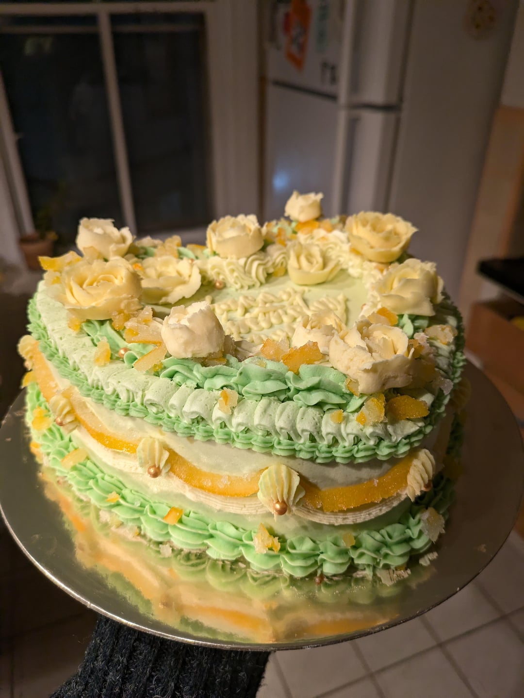 It's a orange olive oil cake, handmade candied oranges and lemons, lemon curd, rosemary buttercream and lemon ginger buttercream :,) Pics aren't the best !