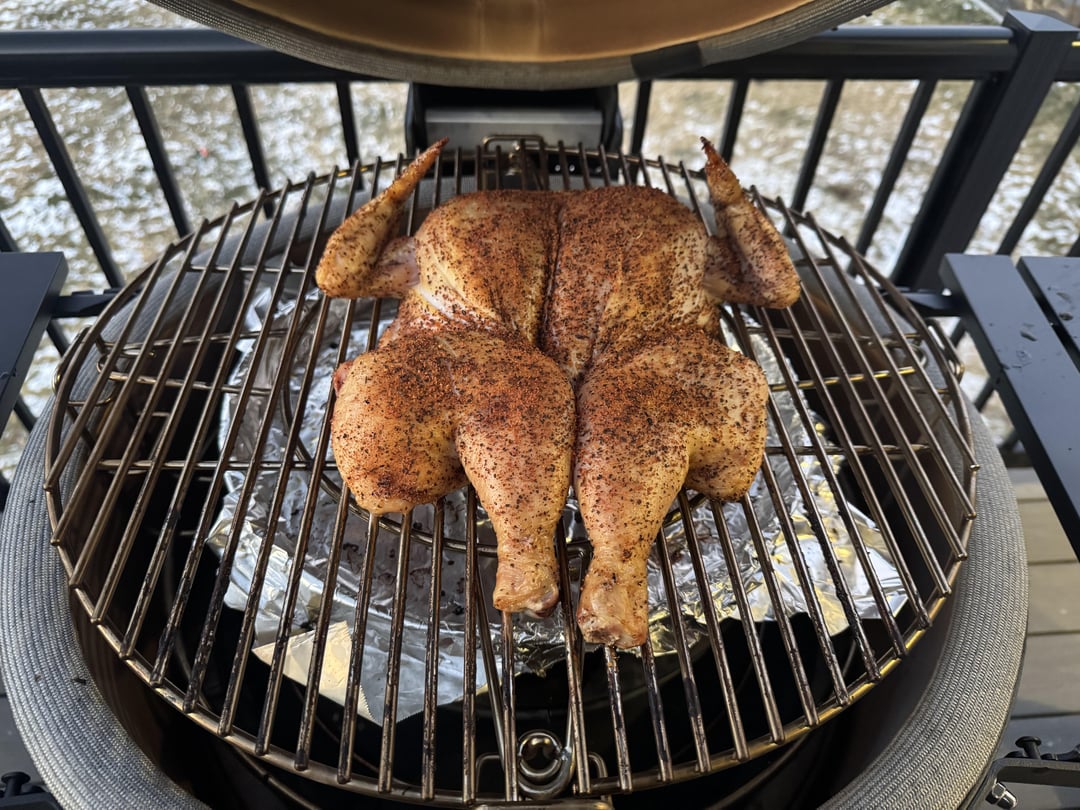 Seasoned it and let it sit in the fridge for about 4 hours. Got grill up to 300 with some hickory and let it cook. At about the hour mark I noticed the grill got down to 275 ish. I ended up keeping the bird in longer than I wanted and the skin ended up a little bit rubbery. Think next time I’ll go 325. Still came out really juicy. I used a Meat Church Holy Cow rub on it. Total time the bird was on the grill for close to 2 hours.