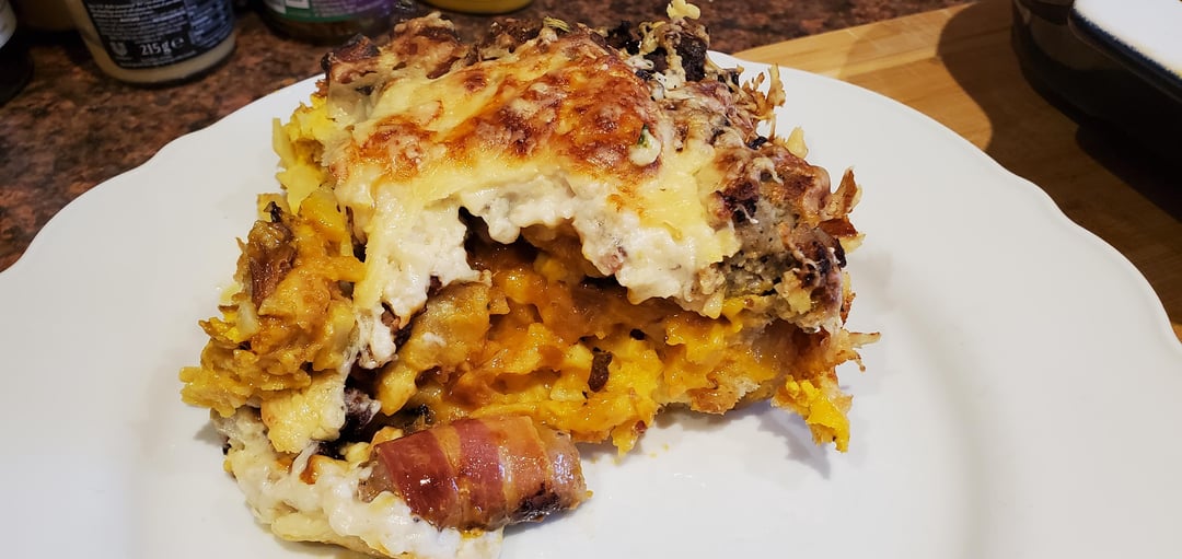 From the bottom up: hash browns, torn up croissants, fried ham with pigs in blankets and sausage chestnut stuffing, a dozen eggs beaten with cream, milk gravy made in the pan I cooked the pig products in, and grated gruyere and cheddar. Bake it for 35 minutes at 175c. It fed seven people handsomely.