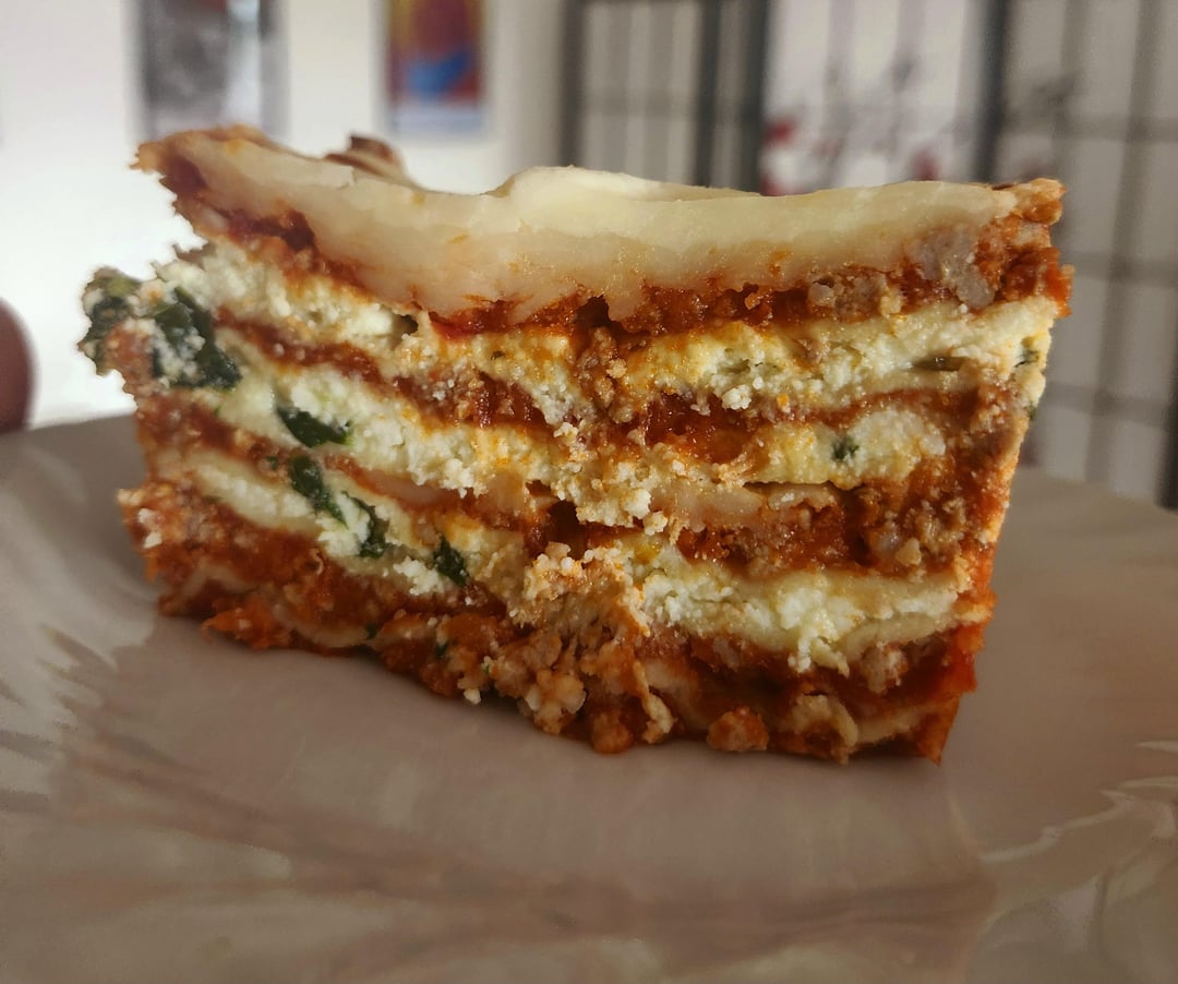 Layer ragù and a mixture of egg, ricotta and spinach. I normally use 1 egg for 2 cups of ricotta. Top is covered with pecorino romano and fresh mozzarella.