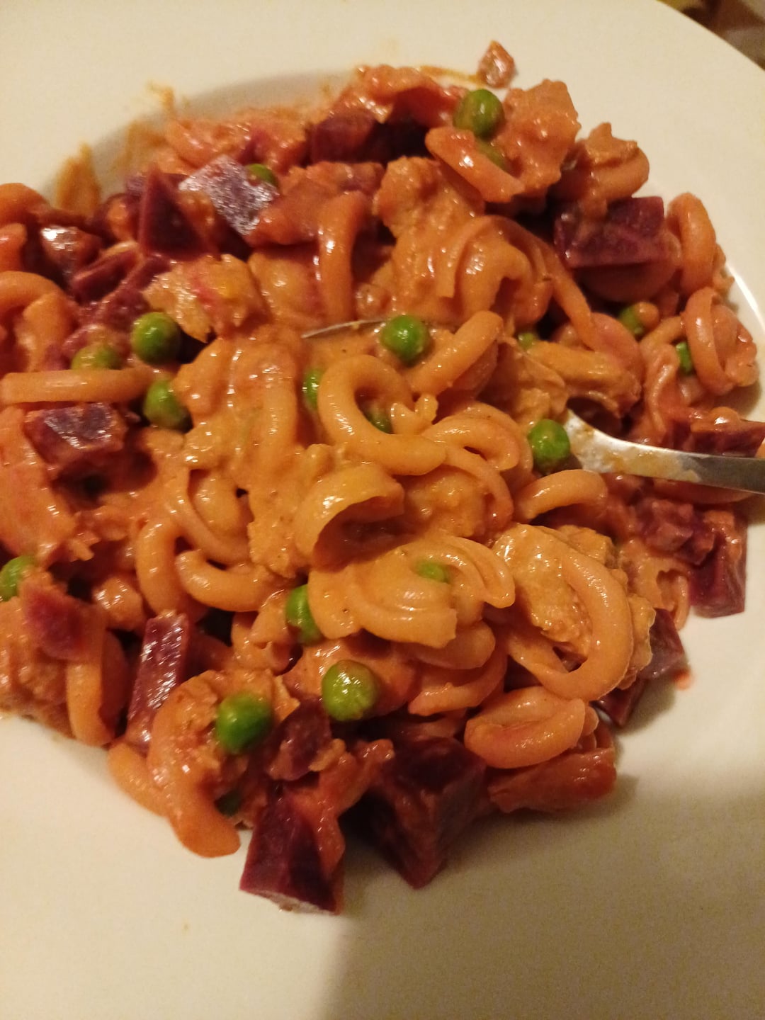 Add the pasta and beets. Mix, cook for a minute or two. Add more water if needed. Add frozen peas. Serve when peas have warmed.