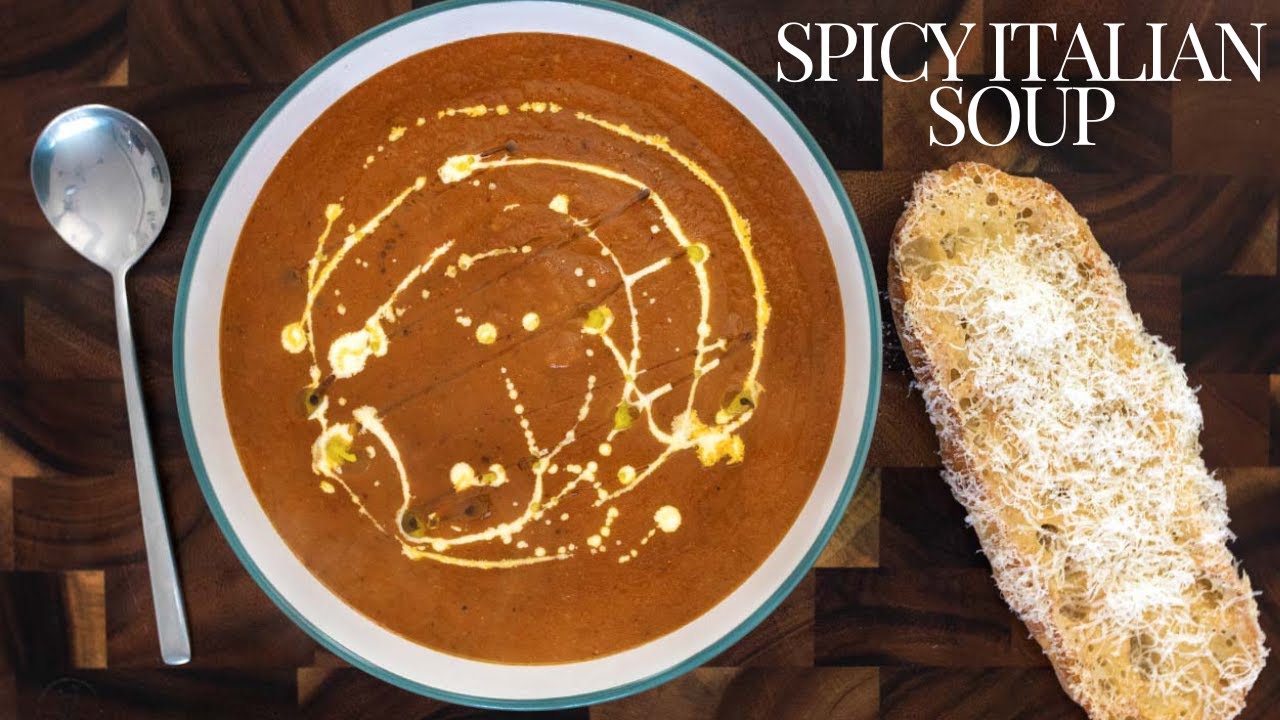 How to make a Spicy Italian Tomato Soup. Learn my NEW Recipe for a delicious spicy Italian Tomato Soup that uses Tomatoes, fresh Basil, fresh Chillies, Stock, Shallots and Garlic. This AMAZING Soup is served with a tasty Parmesan toasted Ciabatta.