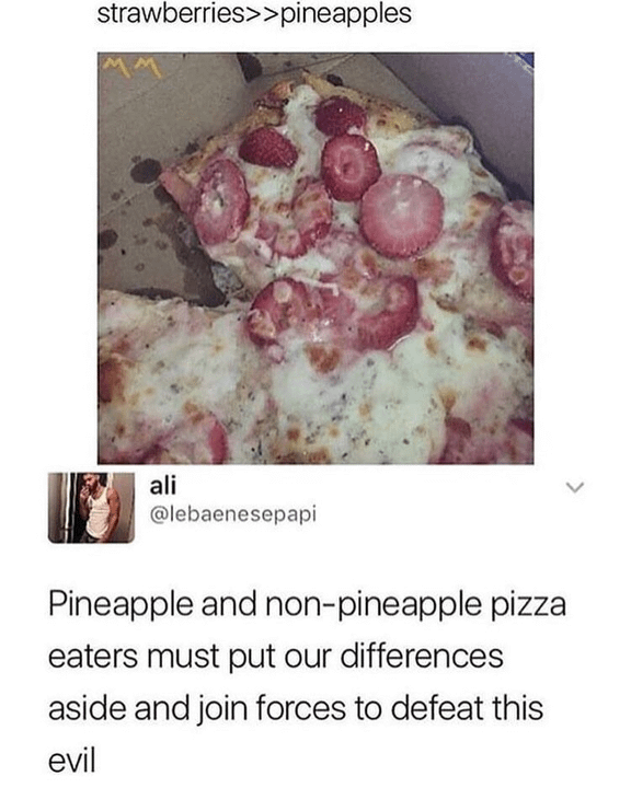 Lost for words by Ojkingbosslife 10 Comments GuyFromLI747 1 year ago This is worse than even the kiwi pizza I’ve seen posted here.. this should be a life sentence type of crime CrustyFlapsCleanser 1 year ago Strawberries and strawberry flavor is my favorite but that thing… gun to my head I’m not eating it. SomeMeatWithSkin 1 year ago Ok but if it was like goat cheese with some basil and balsamic vinegar…Maybe I need some jail time to sort me out too but I’d try it for sure lol DIJames6 1 year ago They need to be eliminated.. kloudrunner 1 year ago Fucking hell. I thought i was looking at grilled cancer. Blunted_Insomniac 1 year ago  Who_am_ey3 1 year ago do you know why it’s in the repost sub?because. it. is. a. repost. dancingtheblues 1 year ago In Brazil we have dessert pizzas that have strawberries, but usually they don’t have cheese, only a chocolate sauce. it’s like french crêpes ToxyFlog 1 year ago Pineapple can be roasted and taste delicous. Dunno about strawberry, though. Scribblebonx 1 year ago Write A CommentYou must be logged in to post a comment.
