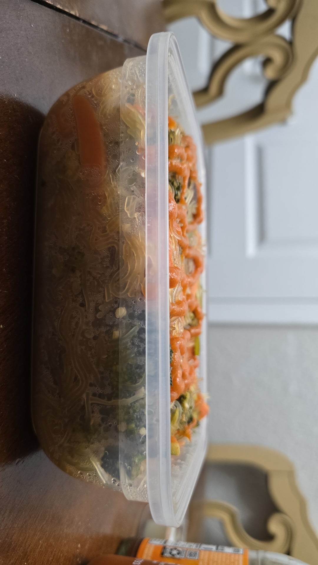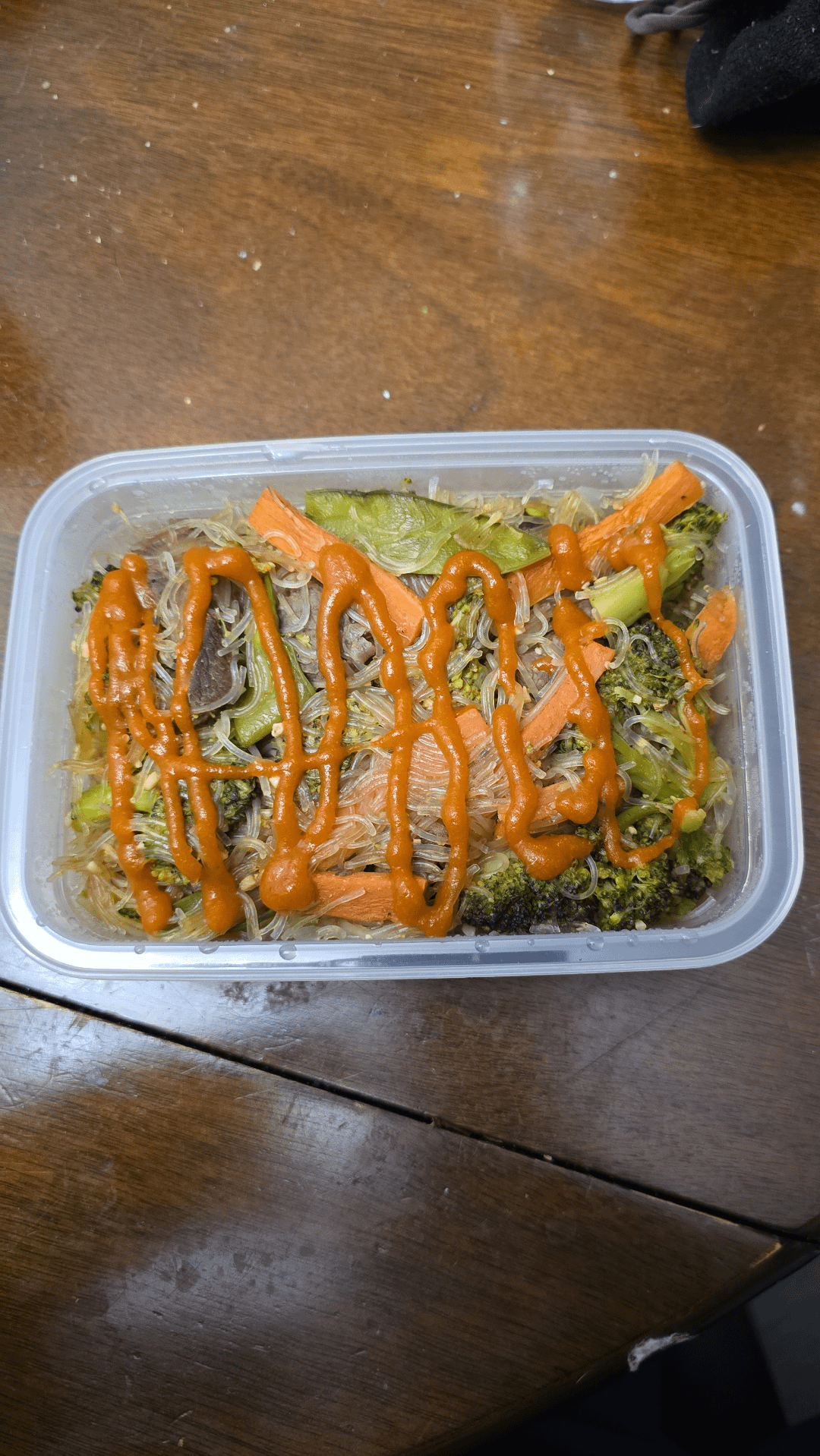 My wife made this dish. It has beef sirloin tips strip, snow peas, broccoli, carrots, and vermicelli. I top it off with ny Sriracha. The whole thing weight about 548 grams. But I have no idea how much my wife of each ingredient into the dish.