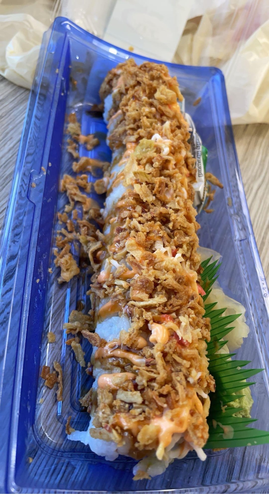California roll with spicy mayo and either panko crumbs or fried onions.