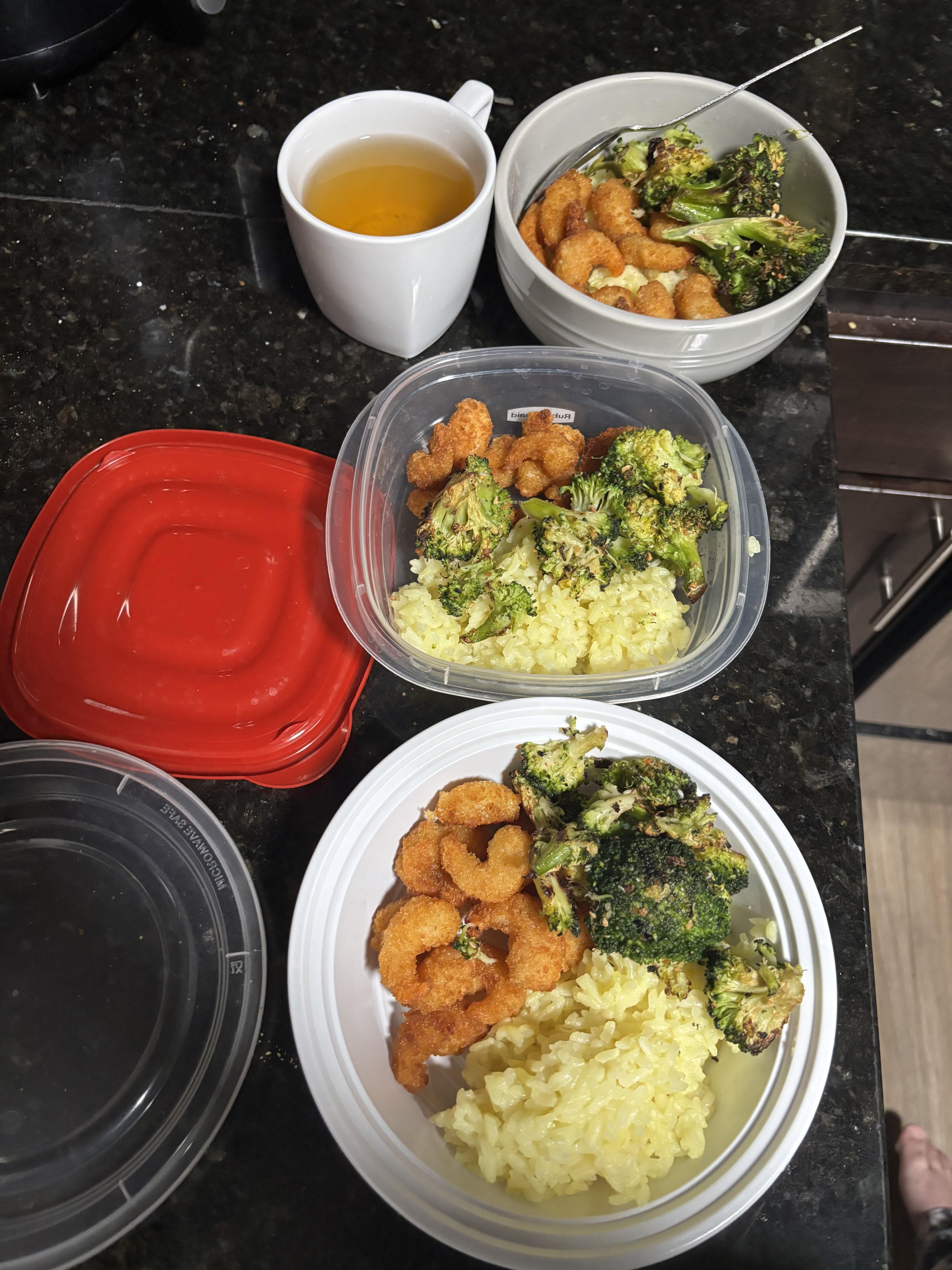 super proud of this it was only 360 calories total and so filling: popcorn shrimp, oven roasted broccoli and rice made with chicken stock by j3nnyb3nny 3 Comments oscargrouchthe 9 months ago Hell yeah! Keep it up 🫶🏻 j3nnyb3nny 9 months ago broccoli: https://www.budgetbytes.com/oven-roasted-frozen-broccoli/ (but adjust based on comment that says cook 20 mins w/o oil then add oil for last 10 mins)rice: https://barefeetinthekitchen.com/simple-asian-rice/shrimp was a frozen package already breaded and ready for oven from brand fremont fish market from aldi Smooth_Wallaby2533 9 months ago lookin goodWrite A CommentYou must be logged in to post a comment.