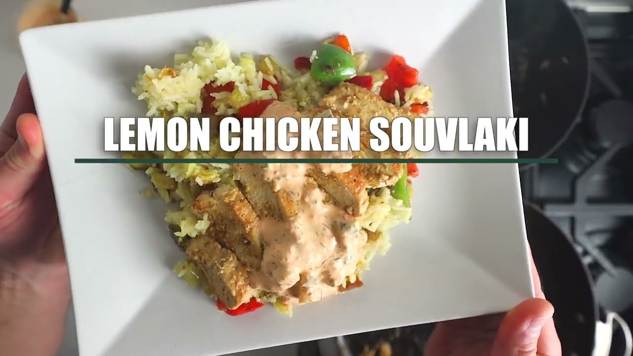 We adore the flavors of a classic Souvlaki, but on a busy weeknight, marinating the meat and loading up skewers is more work than we want. Ours is a streamlined version with lemony chicken served over a flavorful rice pilaf and cooling roasted red pepper Tzatziki sauce. it is just as flavorful but without the fuss.