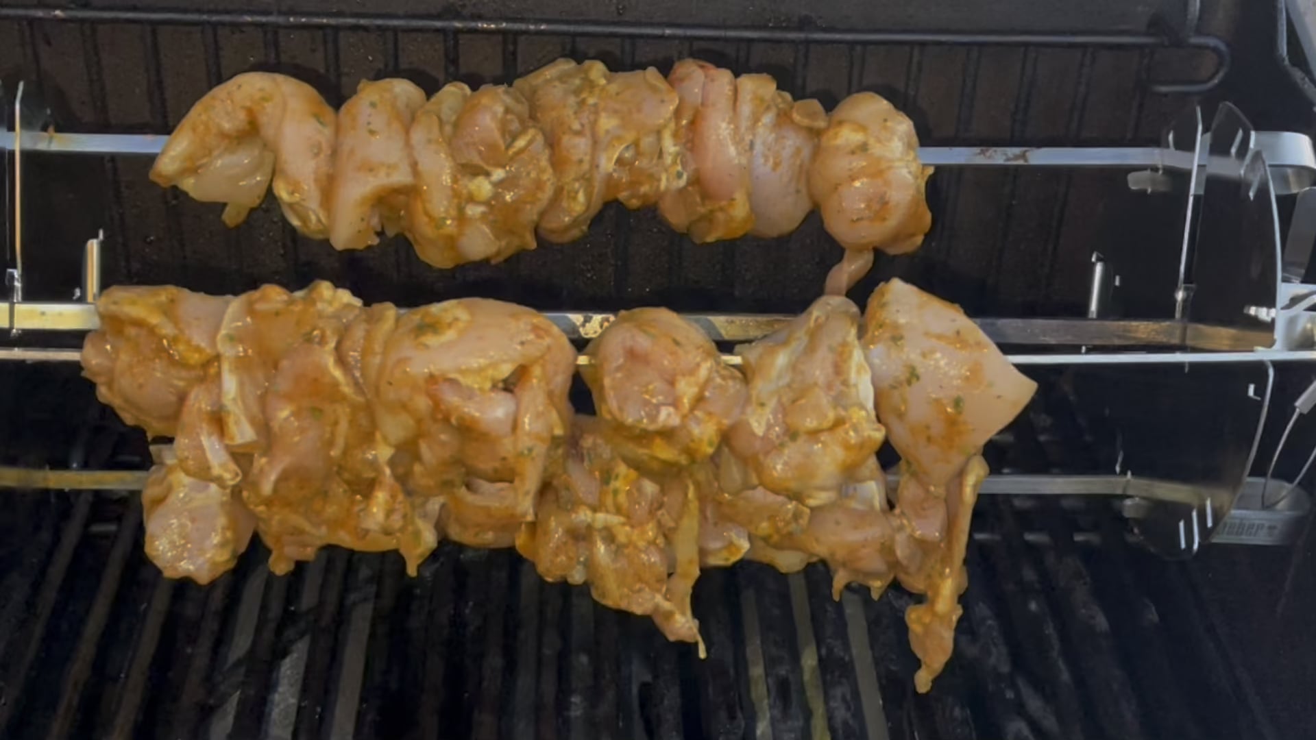 Cooked at 400 degrees for about 30 minutes, basting with sauce through out the cook. Served with a leftover baker, mixed veg and extra Butter sauce on the side. The skewer attachment is getting easier to use with each cook.