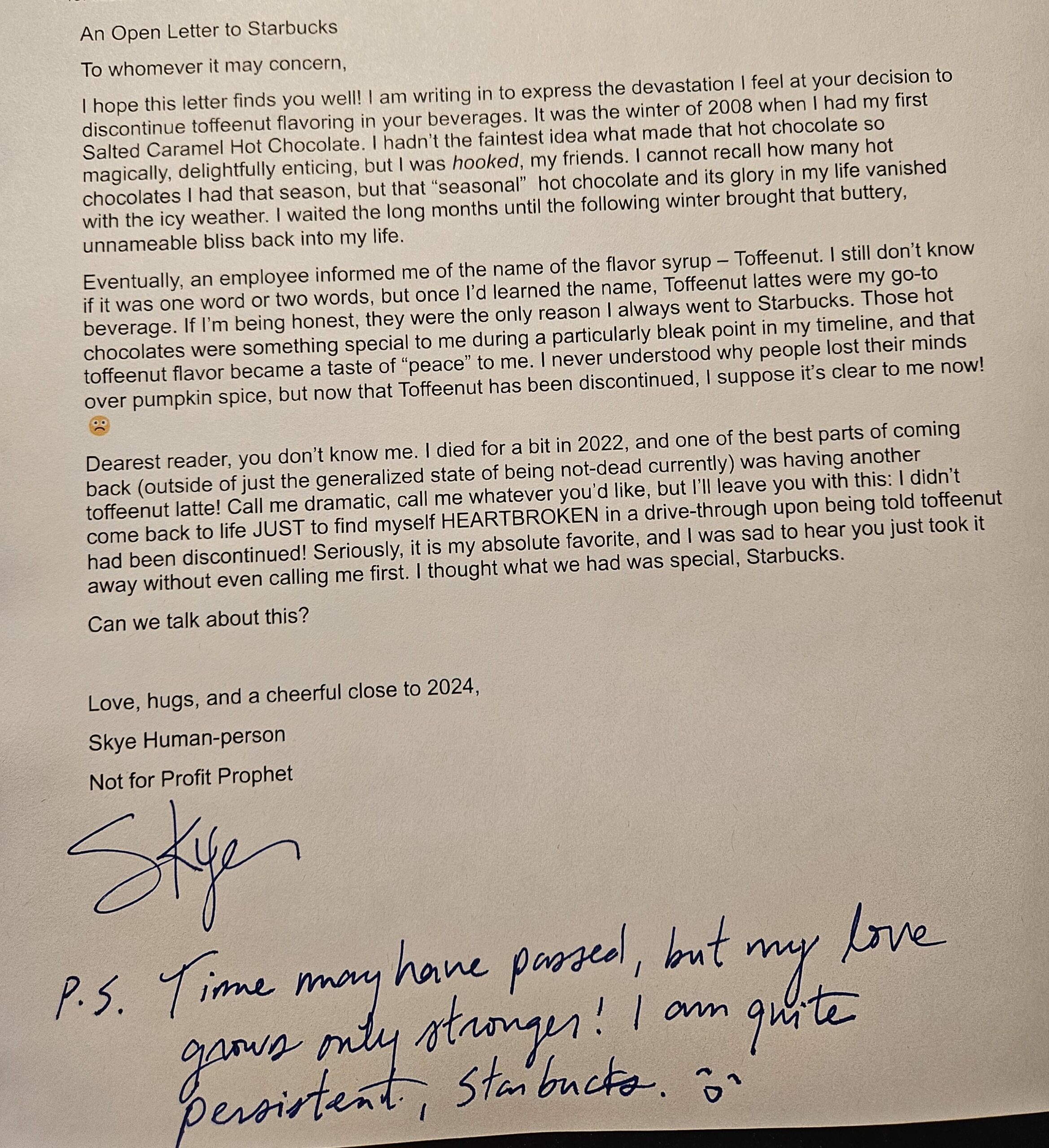 Writing Starbucks until they bring back toffeenut! 🥰 I sent an email (12/30/2024) to their customer service department, but I feel like a wax-sealed envelope might make more of an impact, so that's what's next!