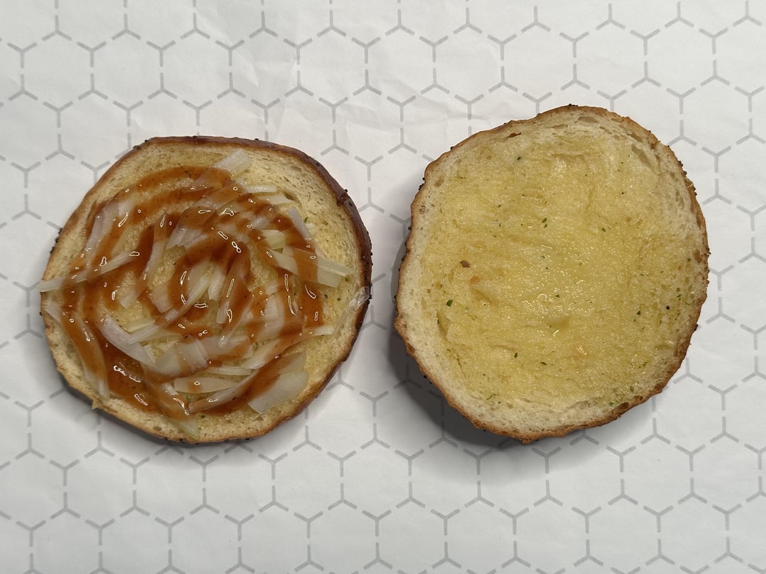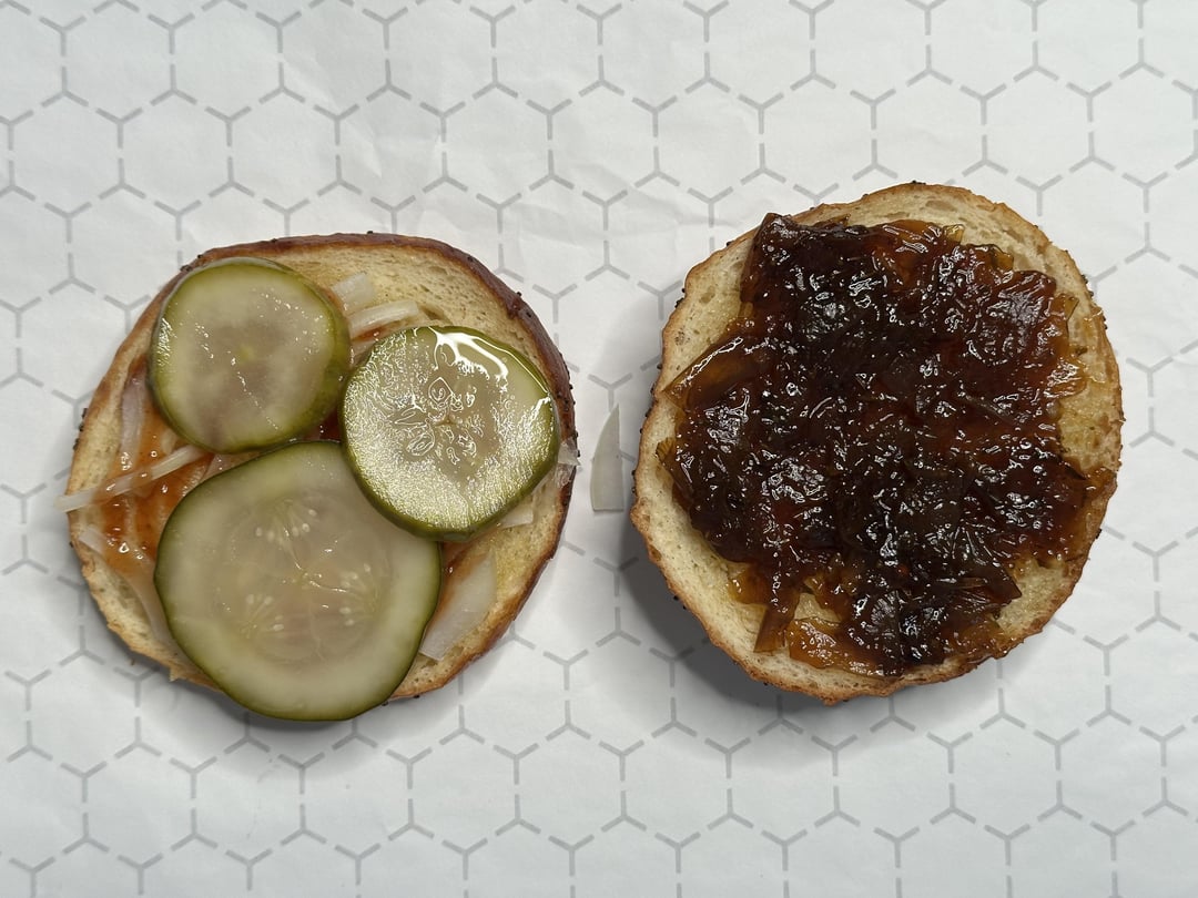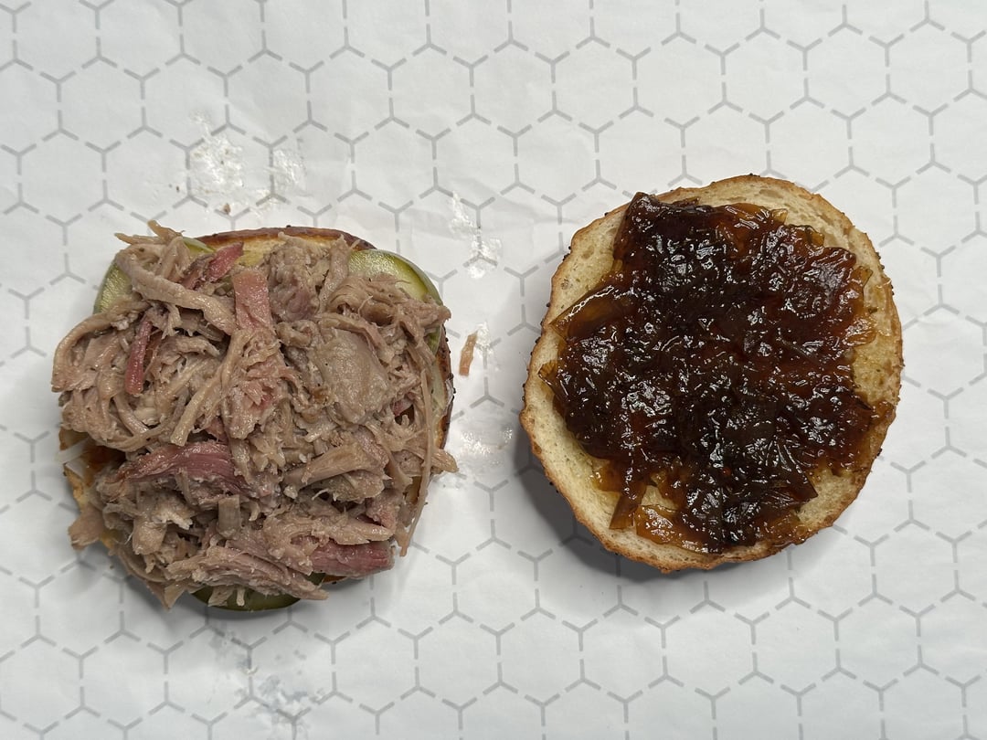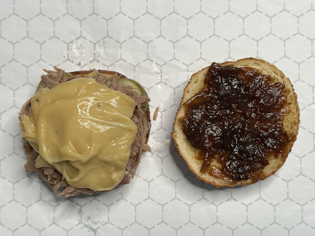 Smoked pulled pork, slivered onions, homemade cheddar cheese sauce, caramelized onions, mustard pickles, Sweet Hot Mambo sauce, on a toasted homemade potato bun with garlic butter.