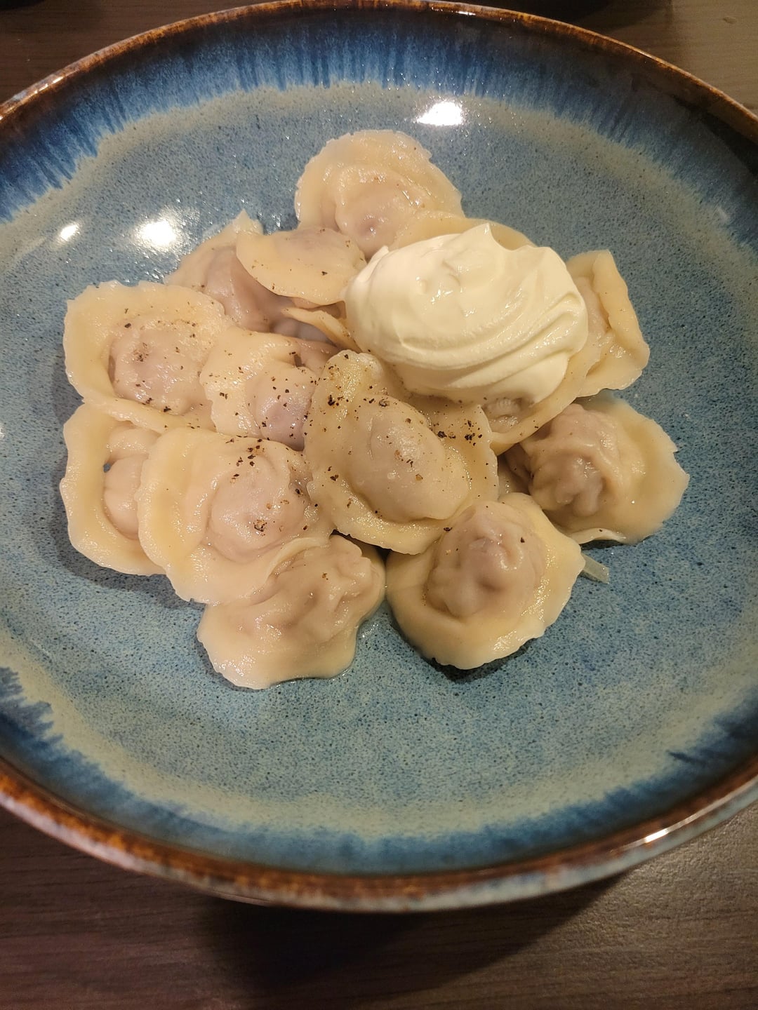 Siberian dumplings, filled with minced meat and onion, cooked in a hefty homemade broth. They are commonly served with a kind of sour cream.