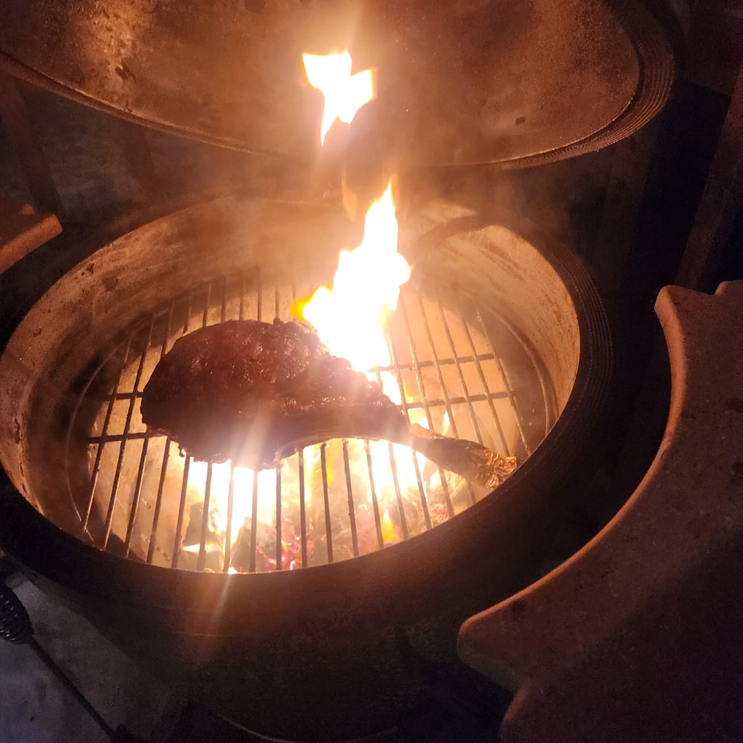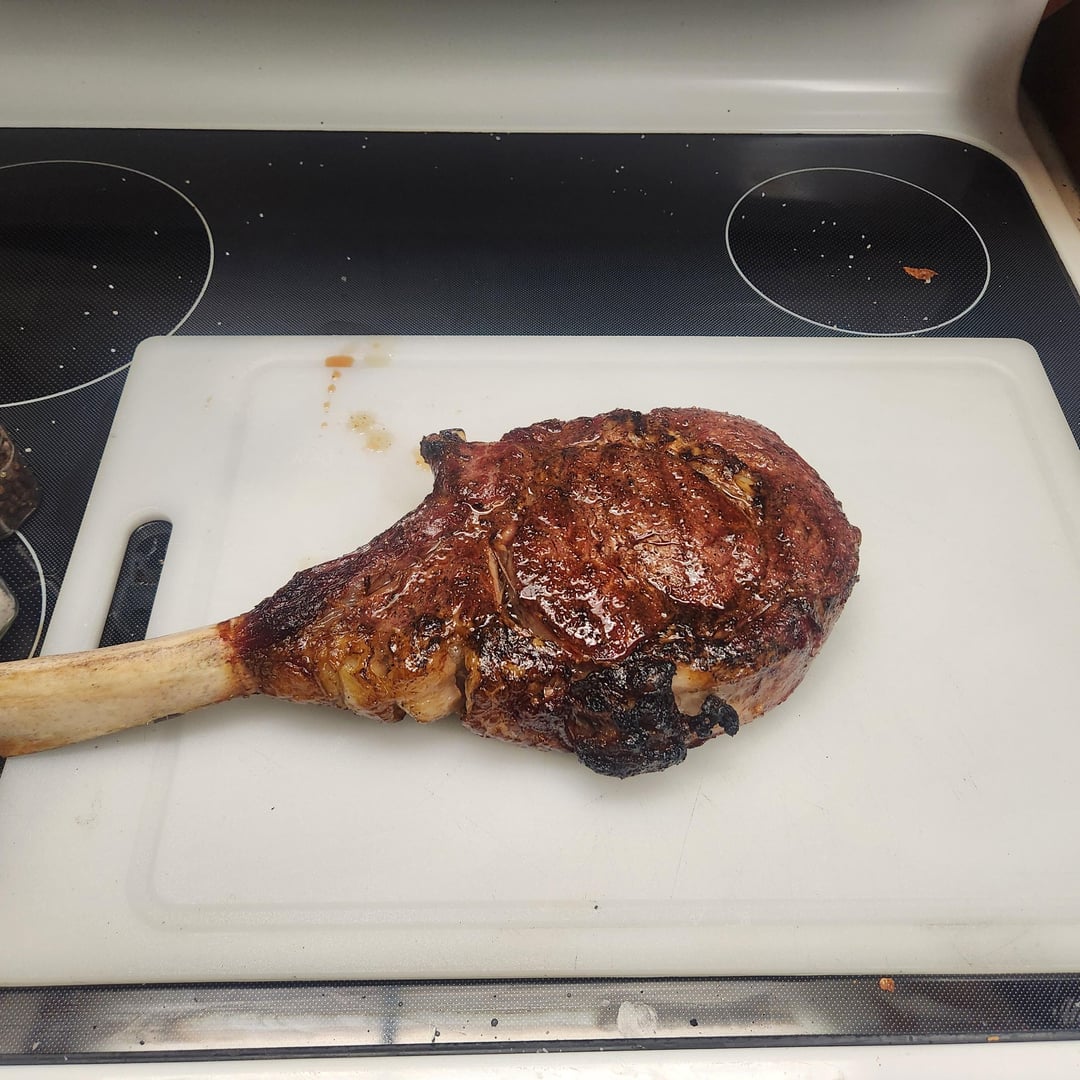I was browsing the meat section today at the grocery store and found a $50 Tomahawk steak marked down to $20 because the sell by date was tomorrow. I jumped all over that and cooked it for dinner tonight. Generously season with course salt and pepper and brought to room temp. Brought the BGE up to 250 and cooked Tomahawk until 75 deg. I then flipped it and cooked to an internal temp of 120. I then removed it and the deflector and cranked that baby up to 600. Another 90 sec on each side and a perfect 130 deg internal temp. Absolutely delicious esp for only $20