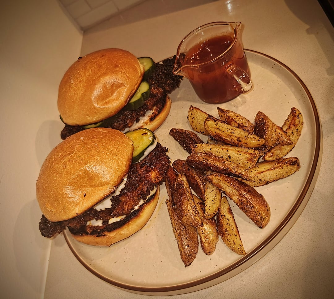 Added ghost pepper puree to the chicken basting sauce, added corn starch to the flower to get the chicken extra crispy, and made a spicy bbq sauce. One of my favorites so far 🍗