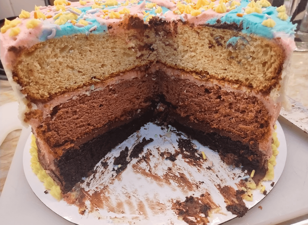 this reminds me of atomic cake my aunt used to make for me when i was younger. it was chocolate, vanilla, and banana with pieces other fillings. was delicious! i bet this one was too.