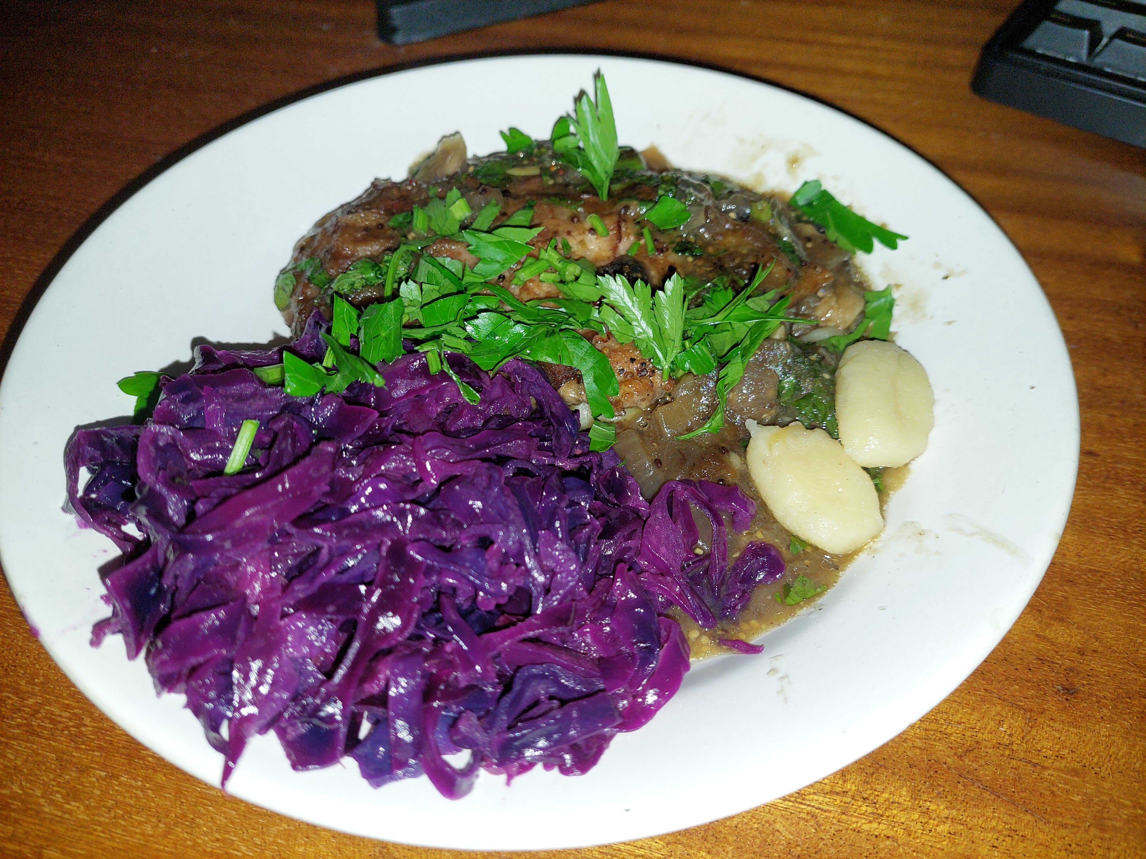 Inspired by “Moravsky vrabec” from yesterday. Used pork neck and ham, added red cabagge with apple and orange juice and gnocchi