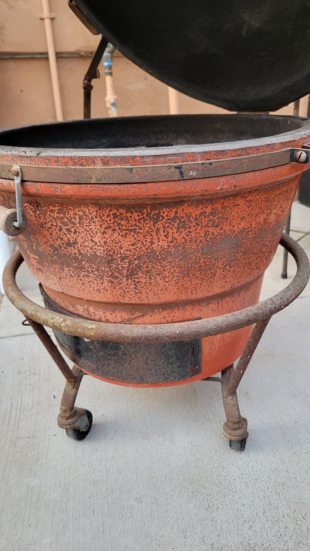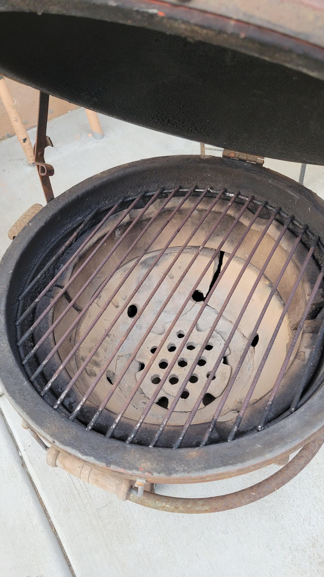 I’ve never had to consider it, but I wonder if you can regulate the exterior? You might try finding a local ceramics shop and approach them for help. I’m assuming you would need to put this in a kiln and apply a new glaze. The metal parts should be pretty easy to refinish. I used a wire wheel and wire brush on the bands and hardware for my Egg, then sprayed everything with high temp black. Came out really nice. Frankly, I don’t know that I’d even try to fix the exterior. It’s an old piece, and the patina just points out the fact that it has a history.