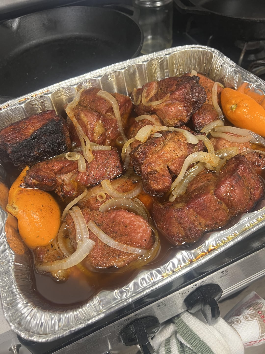 Smoked 7 habaneros, 1/4 onion, 3 Roma tomatoes, 2 jalapeños for about an hour and a half at 250. Blended it up with a mango, garlic, lime juice, and cilantro with a pinch of salt. Ended up coming out too sweet with the perfect amount of habanero heat. Squeezed fresh lime juice, and it’s perfect. More of a salsa verde with not as much smoke as I’d like, but hey. It’s delicious and gonna go great with these smoked carnitas.
