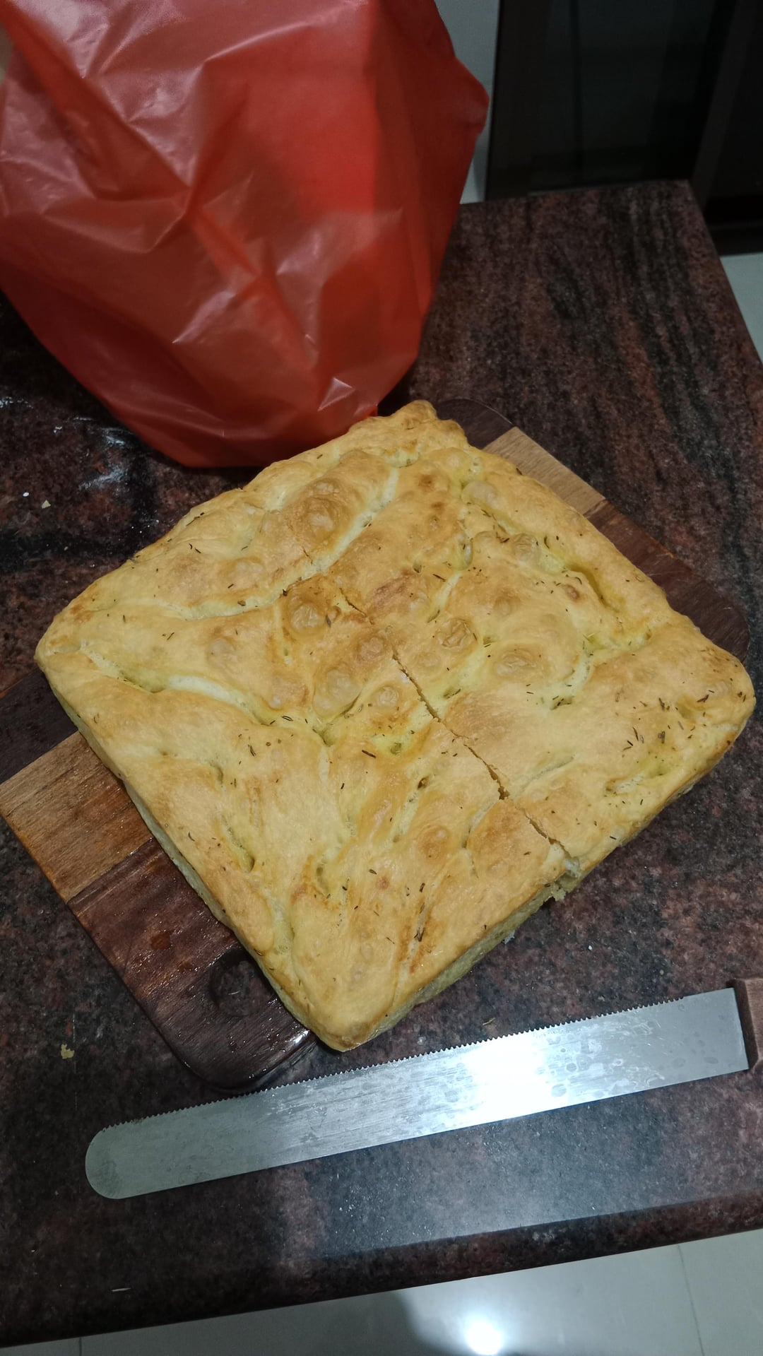 Hihi, I'm currently learning how to make non-enriched bread with dry yeast or sourdough. I've been itching on trying to bake focaccia and decided to bake one with dry yeast and melted margarine. I really should have buy olive oil or extra virgin olive oil but those oil are super expensive in my country. Butter is expensive too. Hence why I use margarine. During the mixing, stretch and fold, and bulk ferment it actually went good. Until time to bake. I think I might overproof the bread since I refrigerated it overnight and then thaw/2nd rise for 2 hours in room temp.