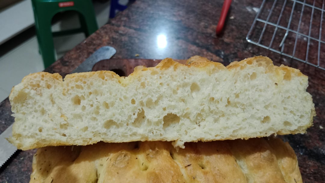 There are crumbs and air pocket. But it kinda gummy? I never eat focaccia before and I assumed it's a mix of baguette and brioche..? Since there's no egg but there is fat/oil. What do you guys think?