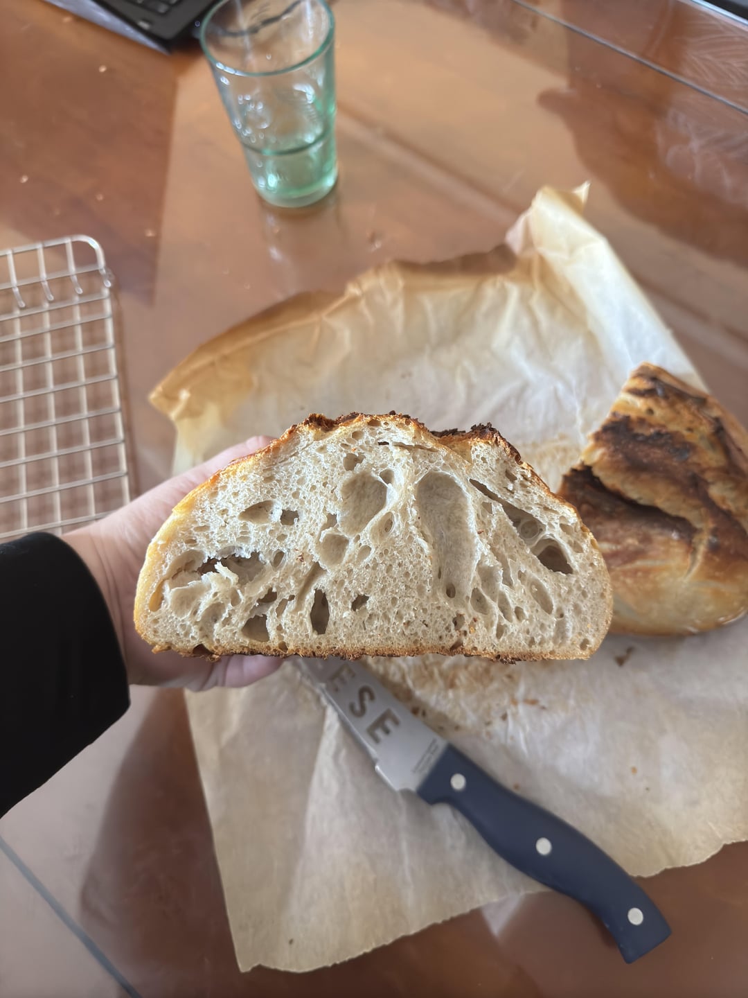 I used 200g starter, 1kg flour, 780g water and 24g salt. 4 set of folding, 3 hour bulking. Baked in a dutch oven 230 degrees for 25 minutes with lid. 210 degrees for 25 minutes without the lid.