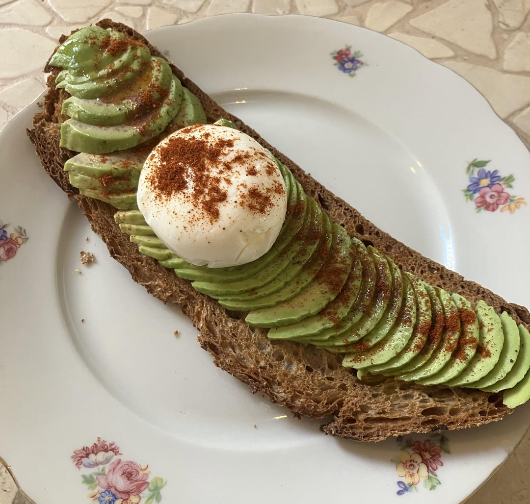 Avocado toast with poached egg and olive oil (500?) and pastry (also 500?)