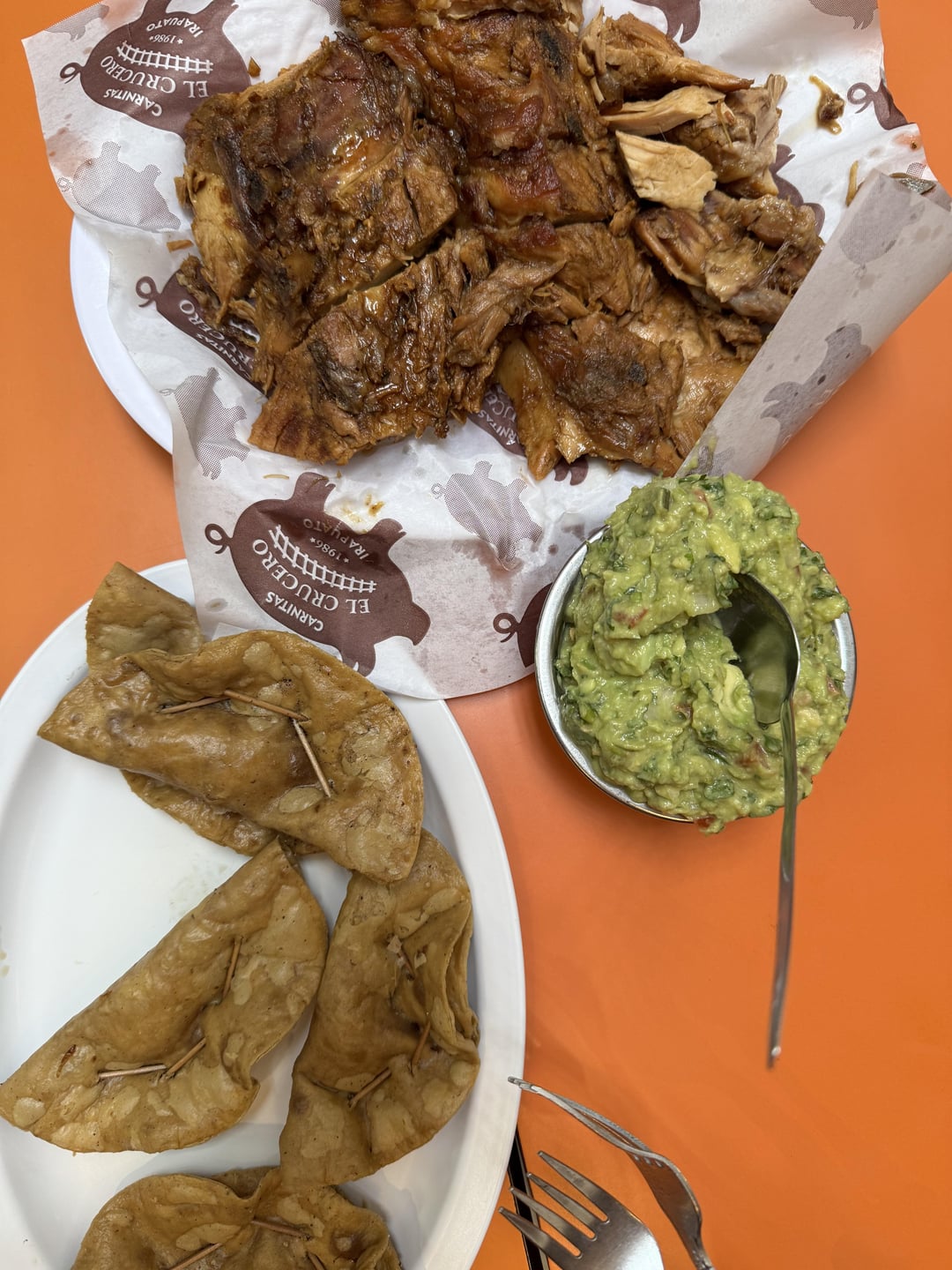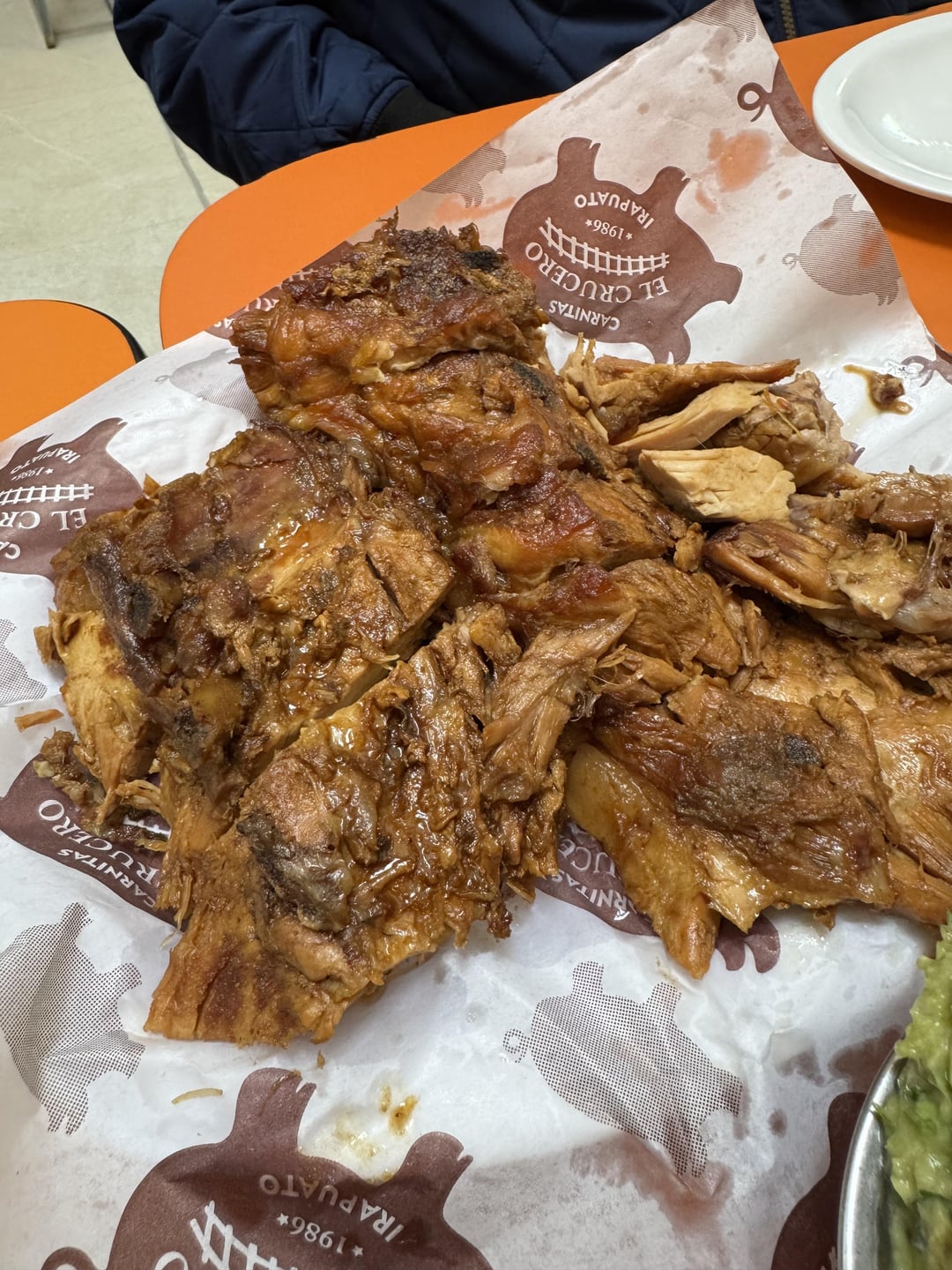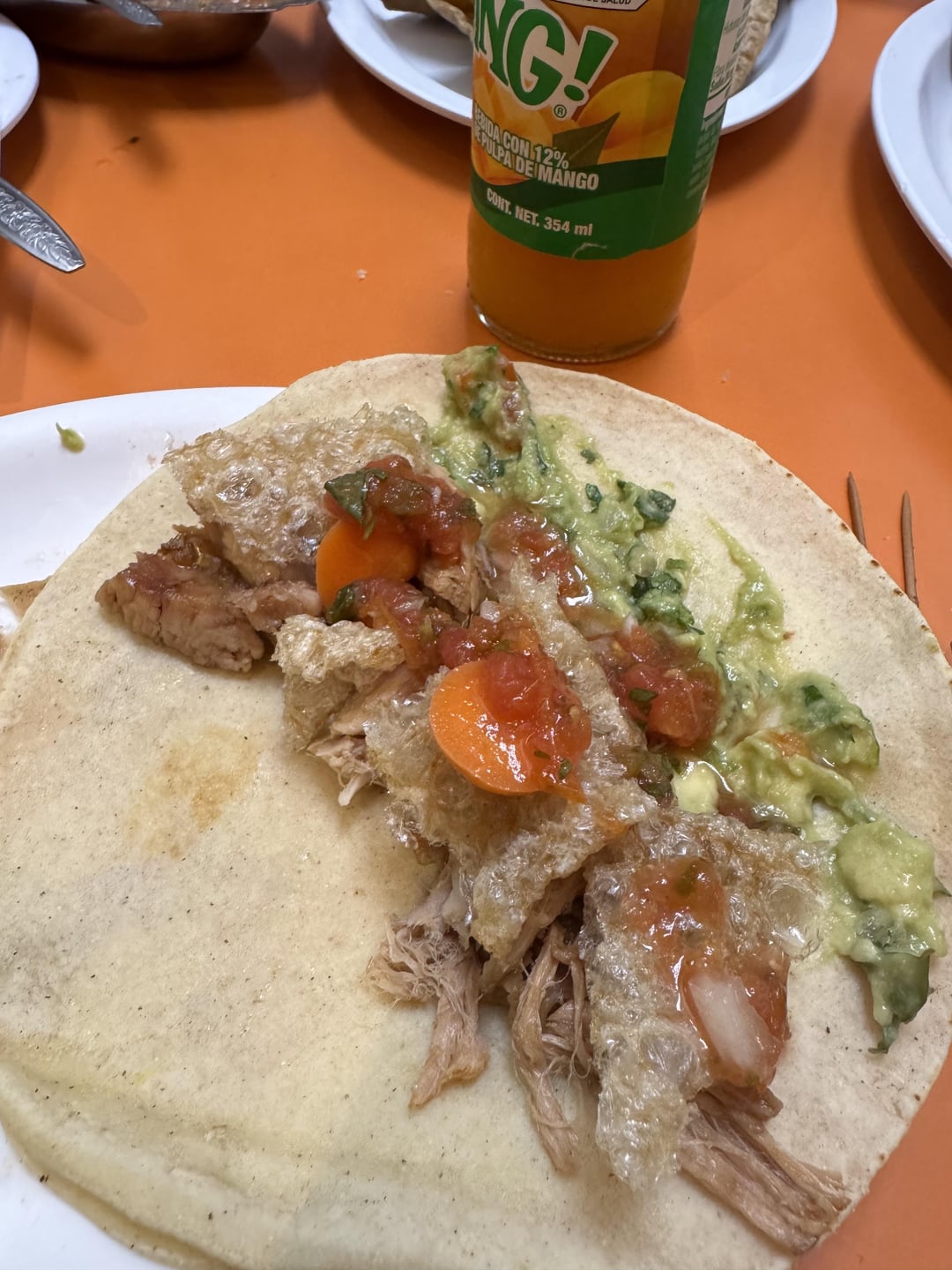 These carnitas on a fresh tortilla, topped with crunchy chicharron, salsa, guacamole and pickled carrots. Also can be had with tacos dorados or bolillos. Washed them down with Boing Mango.Location: El Crucero, Irapuato by amsterdamvibes Write A CommentYou must be logged in to post a comment.