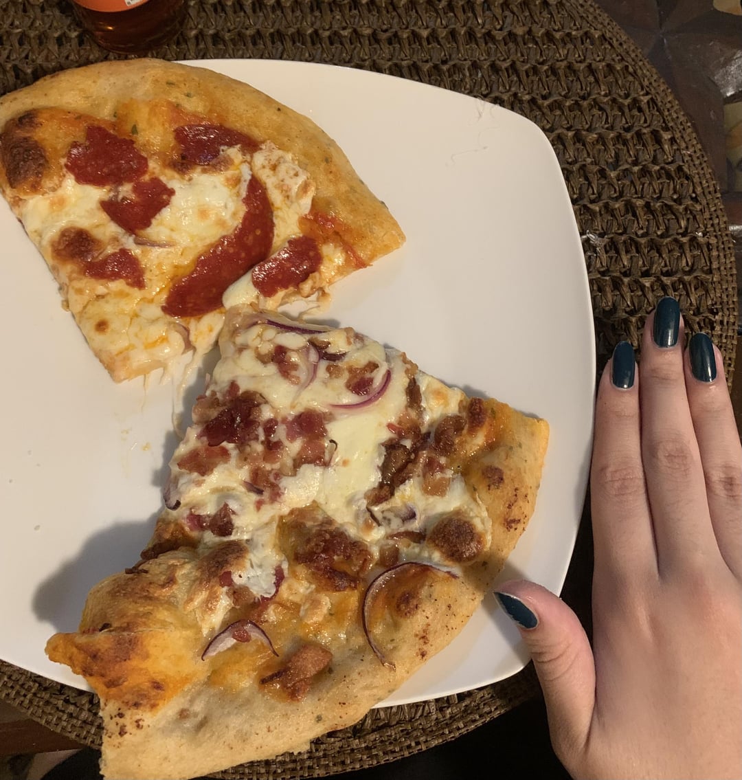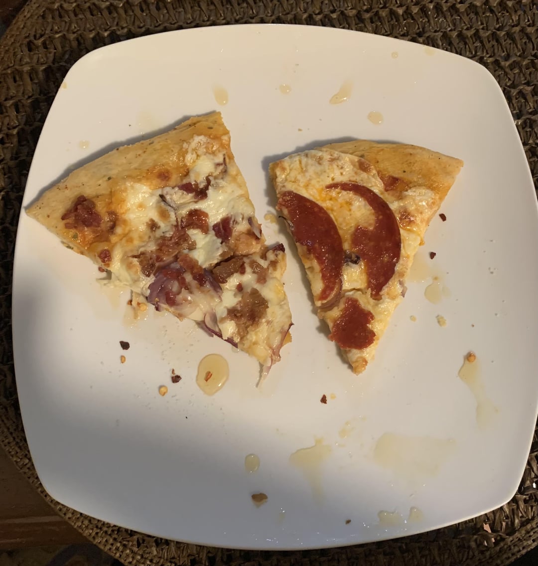 one slice has pepperoni and onion and the other one has bacon bits and onion, they both have pink sauce. the second pic are not leftovers they’re other pieces of pizza and the liquid around it is honey lol