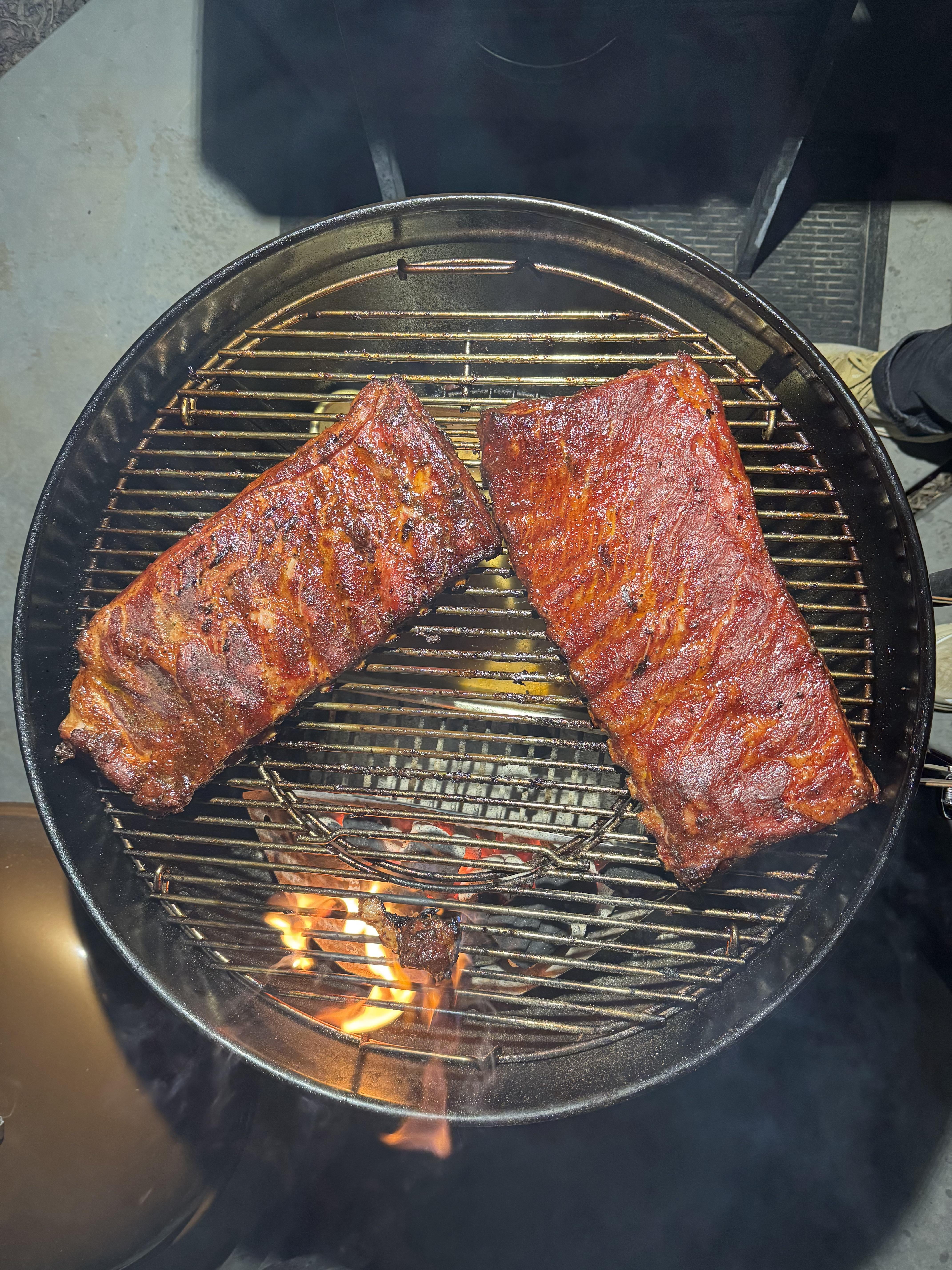 Read somewhere letting some fat render over the coals will add flavor. Also saw somebody use a single char basket to make ribs and wanted to try So far it’s going well, using Kingsford original…I’ve added a few on 2 occasions to keep temp up. Final stretch…