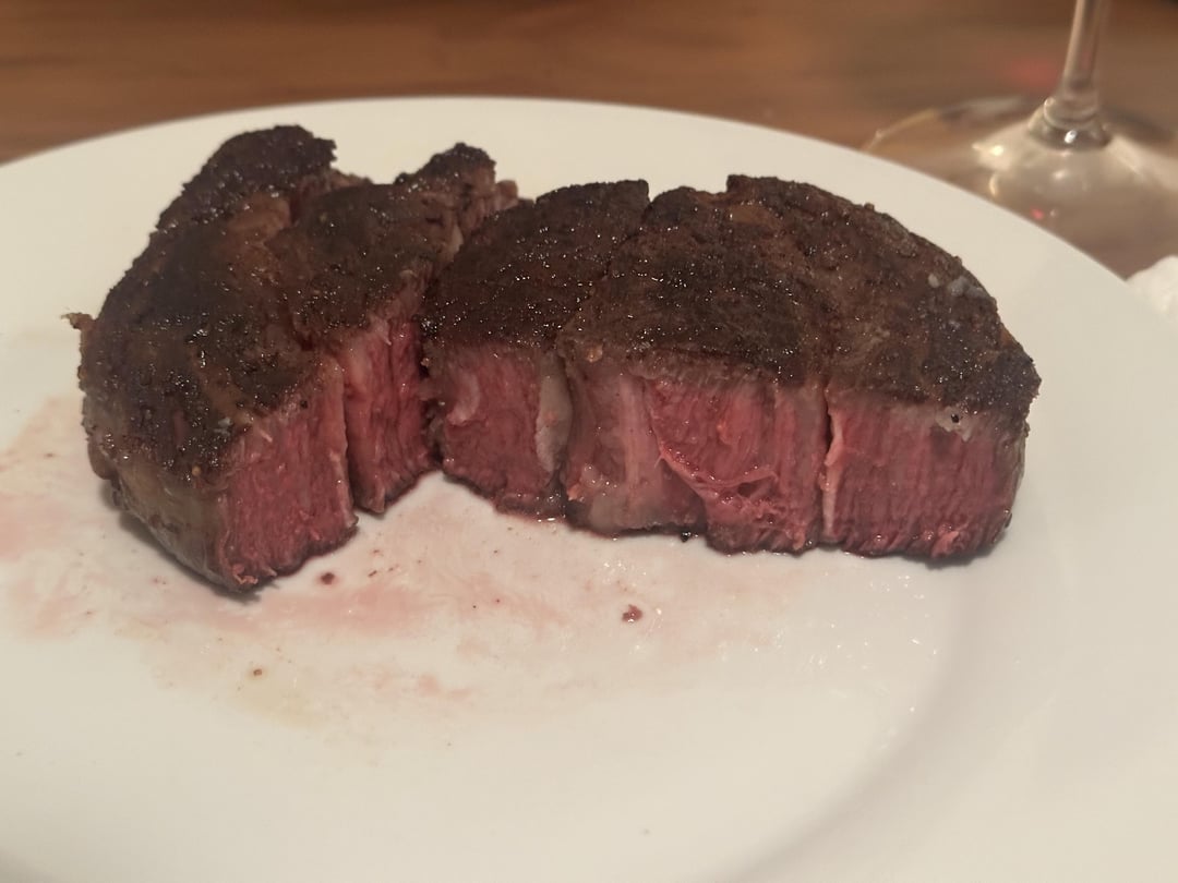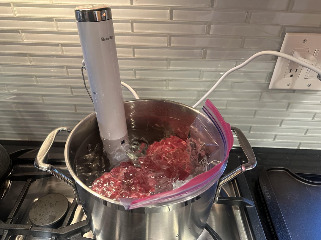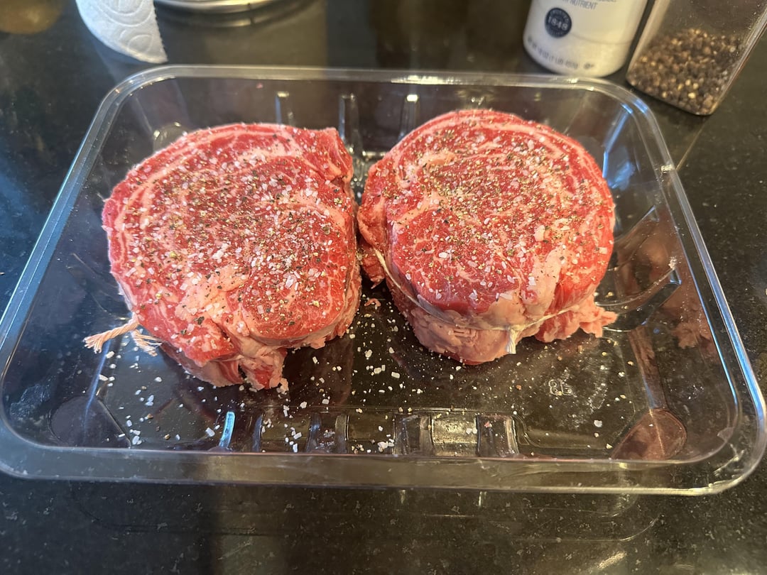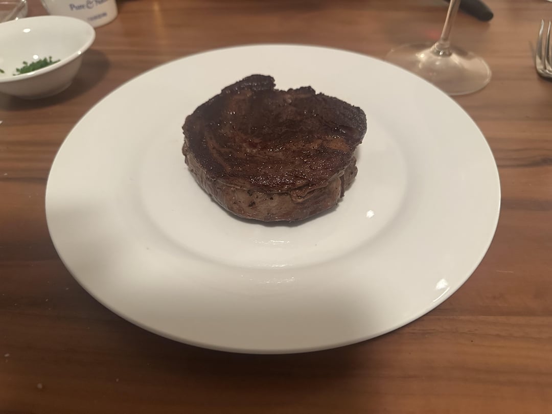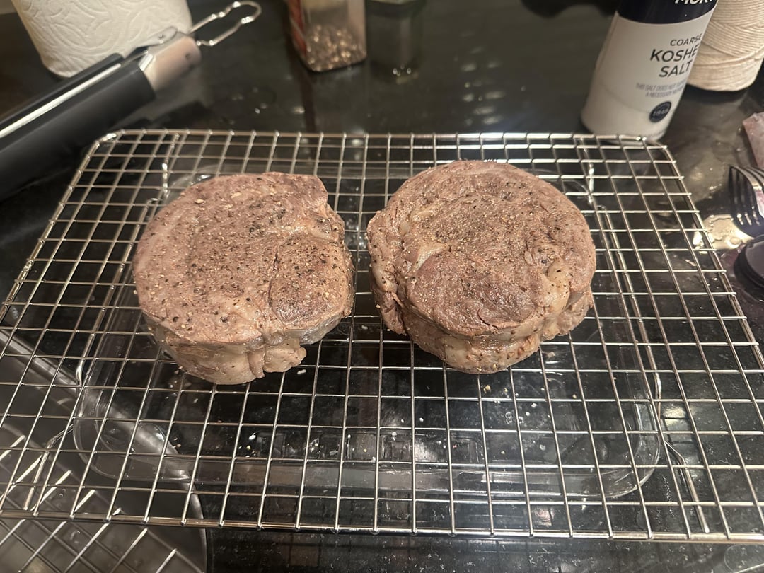 Prime ribeye cap steak at 137 for 1 hr 45 min. 15 min in the freezer on a wire rack. 1 min sear on each side on a ripping cast iron using my gas grill’s side burner with a bit of beef tallow.