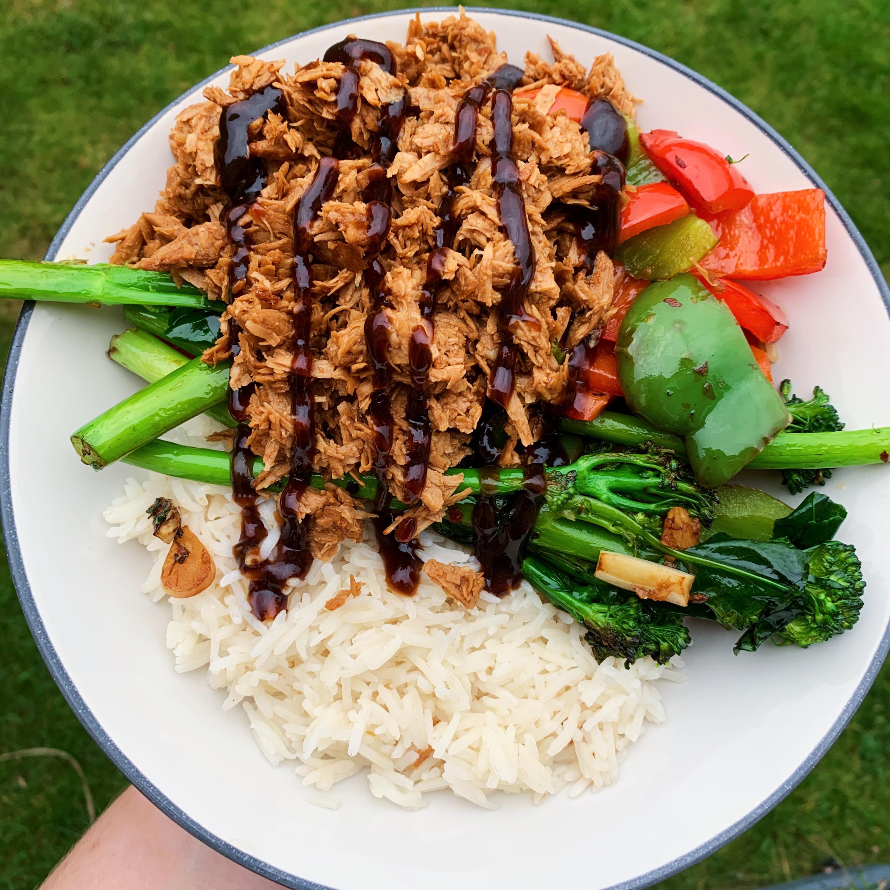 Linda McCartney hoisin duck, rice and garlic veggies.