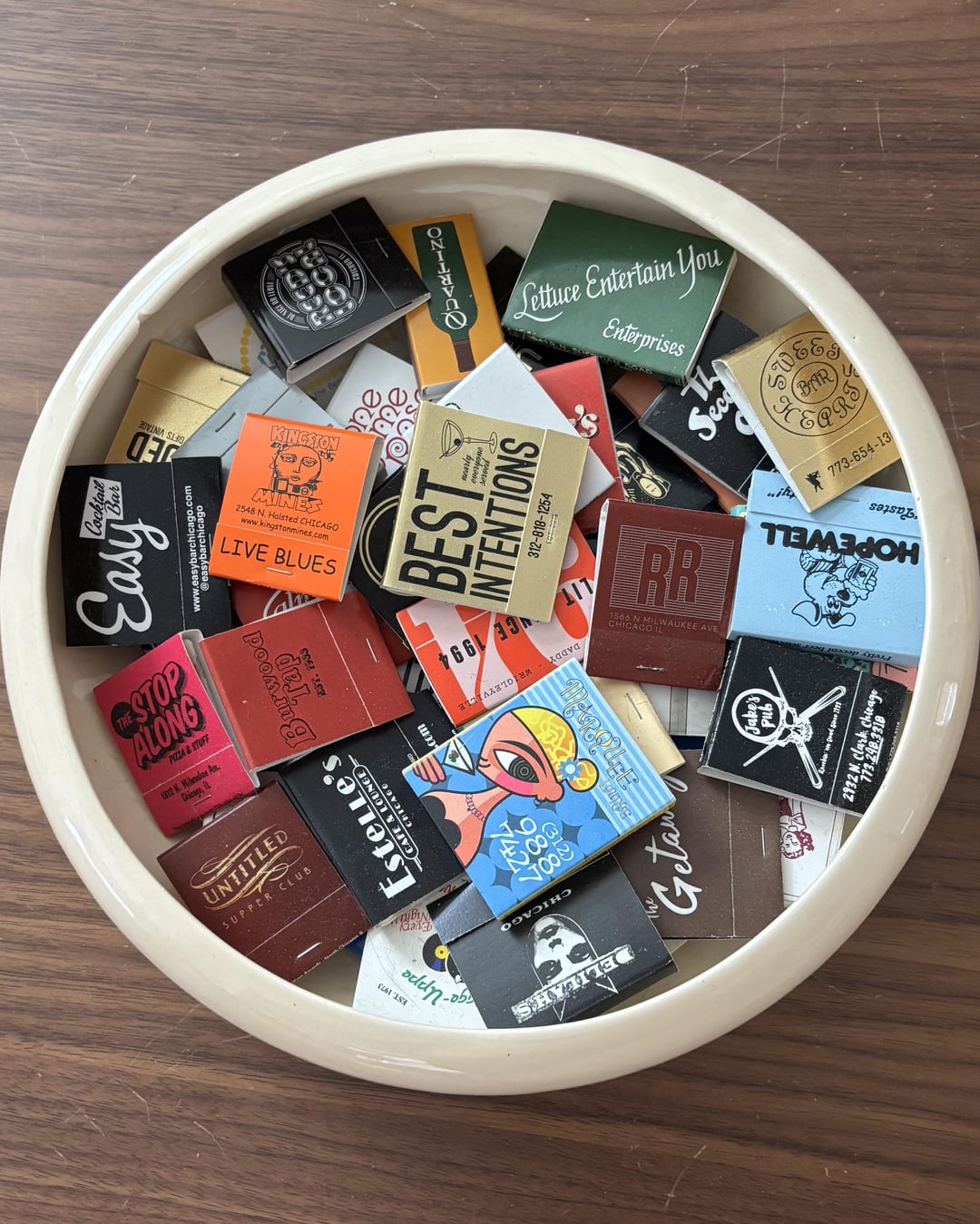 I got married in Vegas last March, which inspired me to start collecting matchbooks here at home. Using Reddit threads, Instagram accounts, and information from MatchbookTraveler.com, I complied a pretty extensive list of places that (allegedly) have matchbooks up for grabs. I still have a LOT more to collect, but looking at this dish every day makes me so happy! Sourcing these has been a really fun way to explore the city and check out new places I may not have visited otherwise.