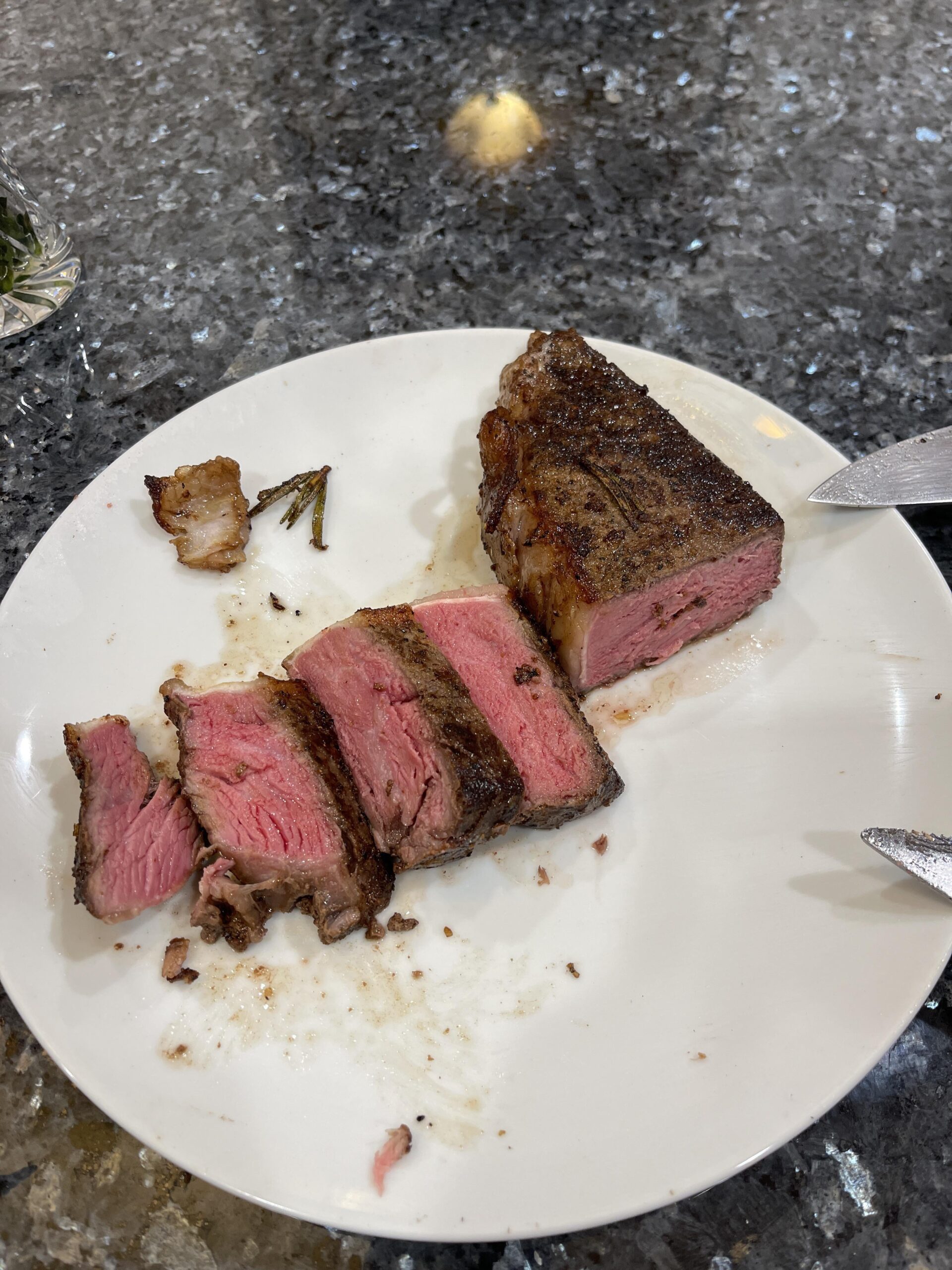 My first SV steak, New York strip at 133° for 2.5 hours then ice bath for 10 minutes and a hot sear. Pretty damn good!