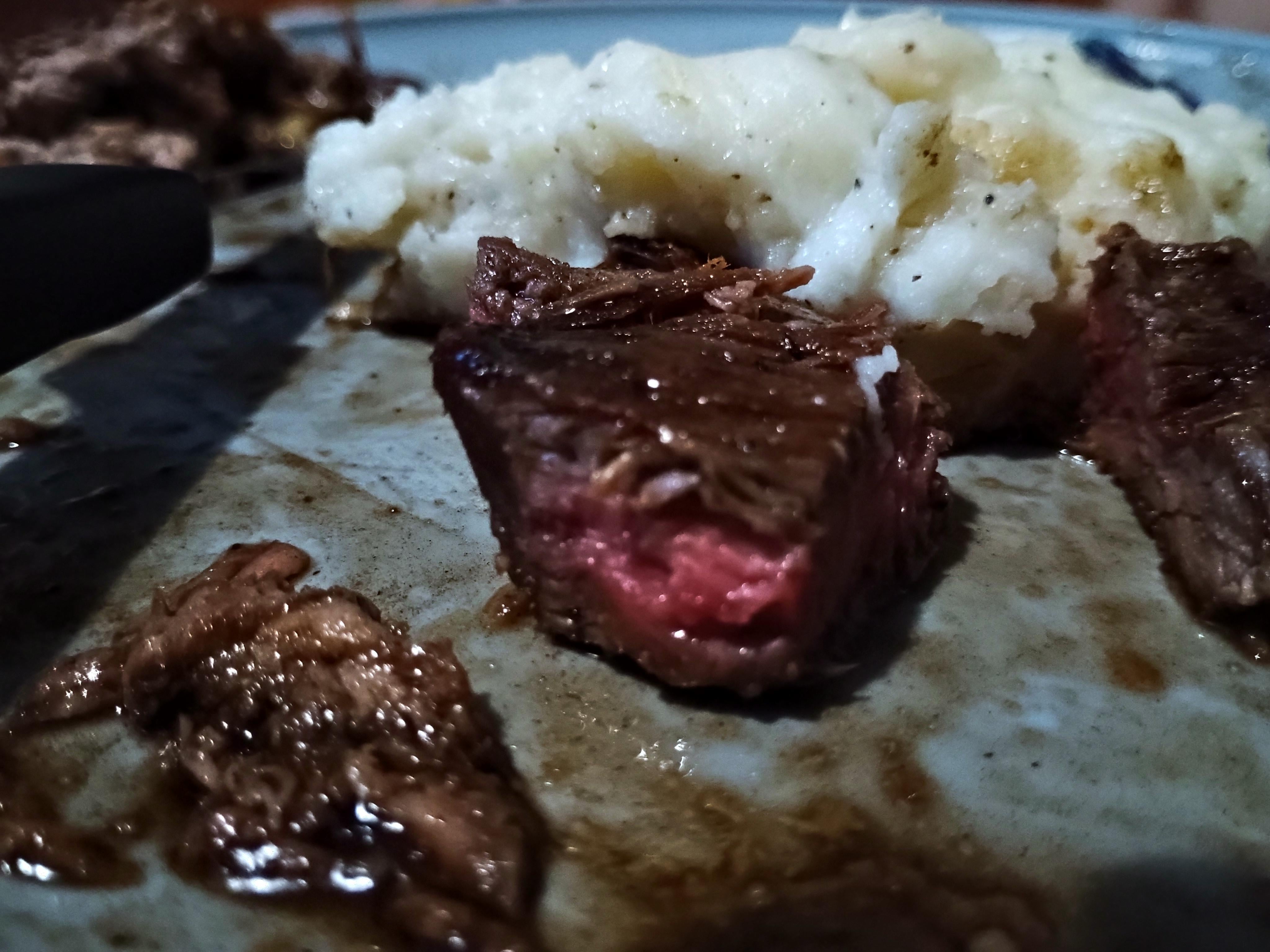 Already ate most of it but then decided to share. It could've cooked less, it was pretty chewy, still some red in the center. Added too much salt, but was still really good. Didn't have patience to make potatos from scratch so I made instant, was hungry and was eager to try my steak.