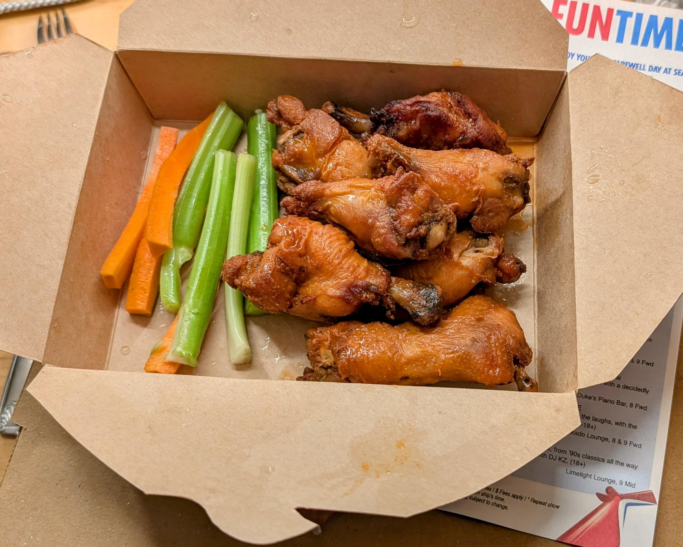 My wife took advantage of the drink package and drunk ordered some food. They were surprisingly good, heat level was okay, crispiness would have probably been better if they weren't delivered to the room.
