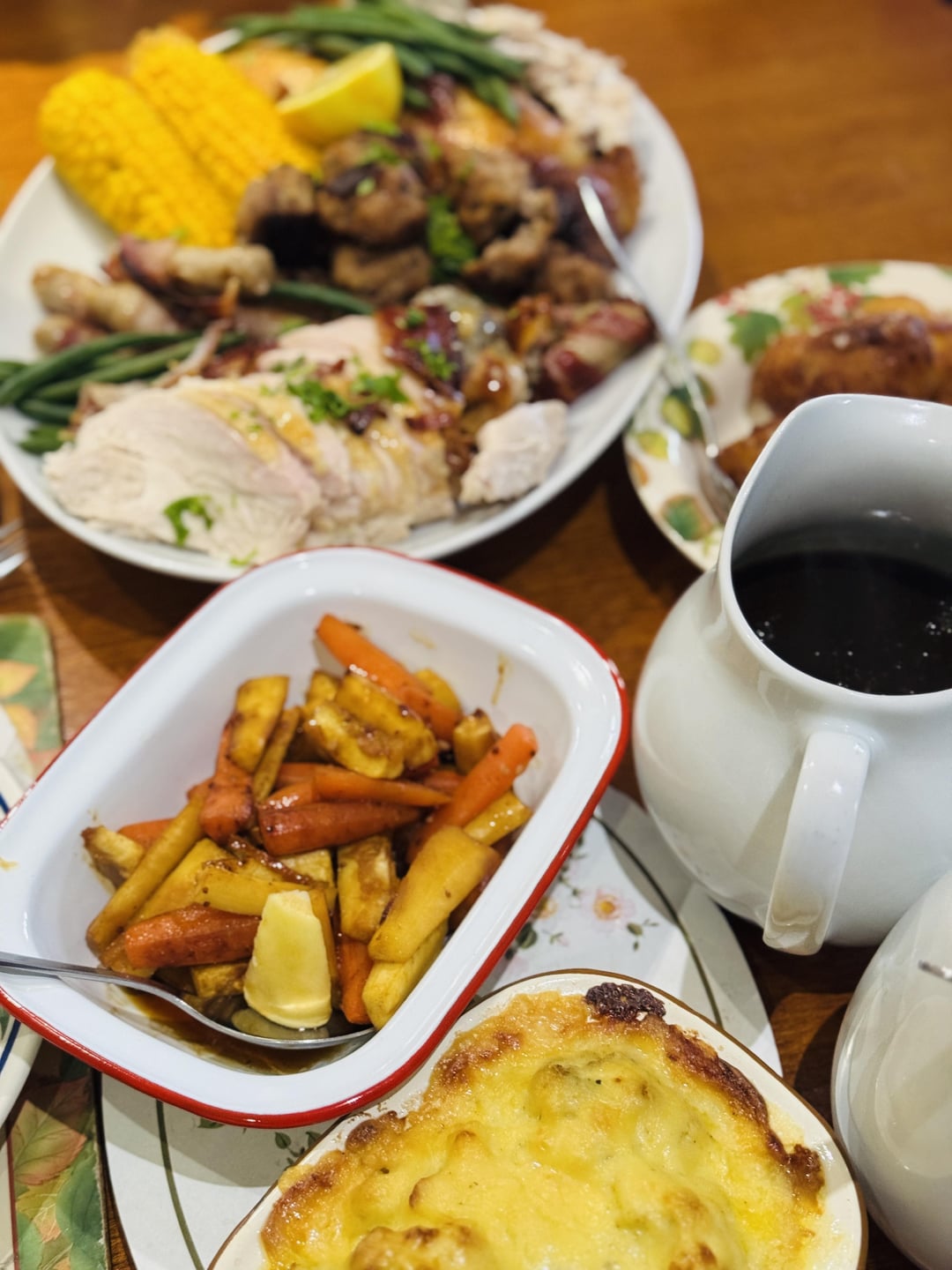 Also homegrown corn from the freezer, green beans, potatoes roasted in Wagyu dripping, truffled cauliflower cheese, ginger and orange marmalade glazed carrots and parsnips, plus gravy and bread sauce.