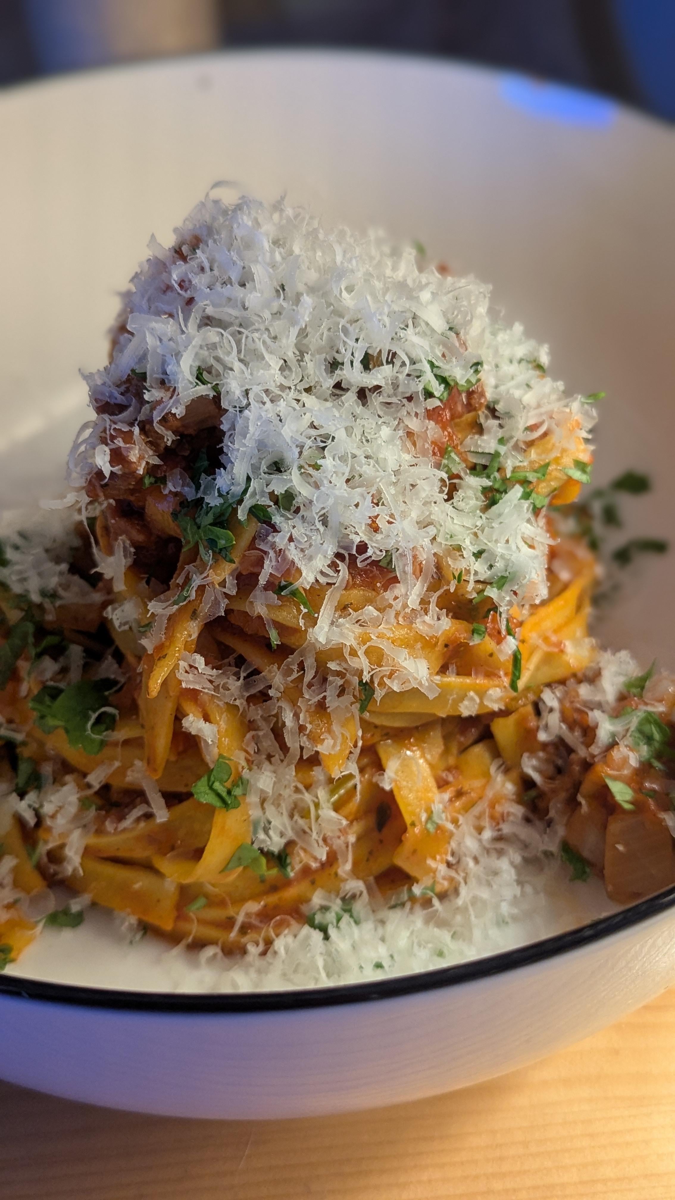 Started out by browning the ground lamb in olive oil, once I had a fond starting I added the aromatics and herba, sauteed them before added tomato paste, deglazed all that with white wine and added the crushed tomatoes.