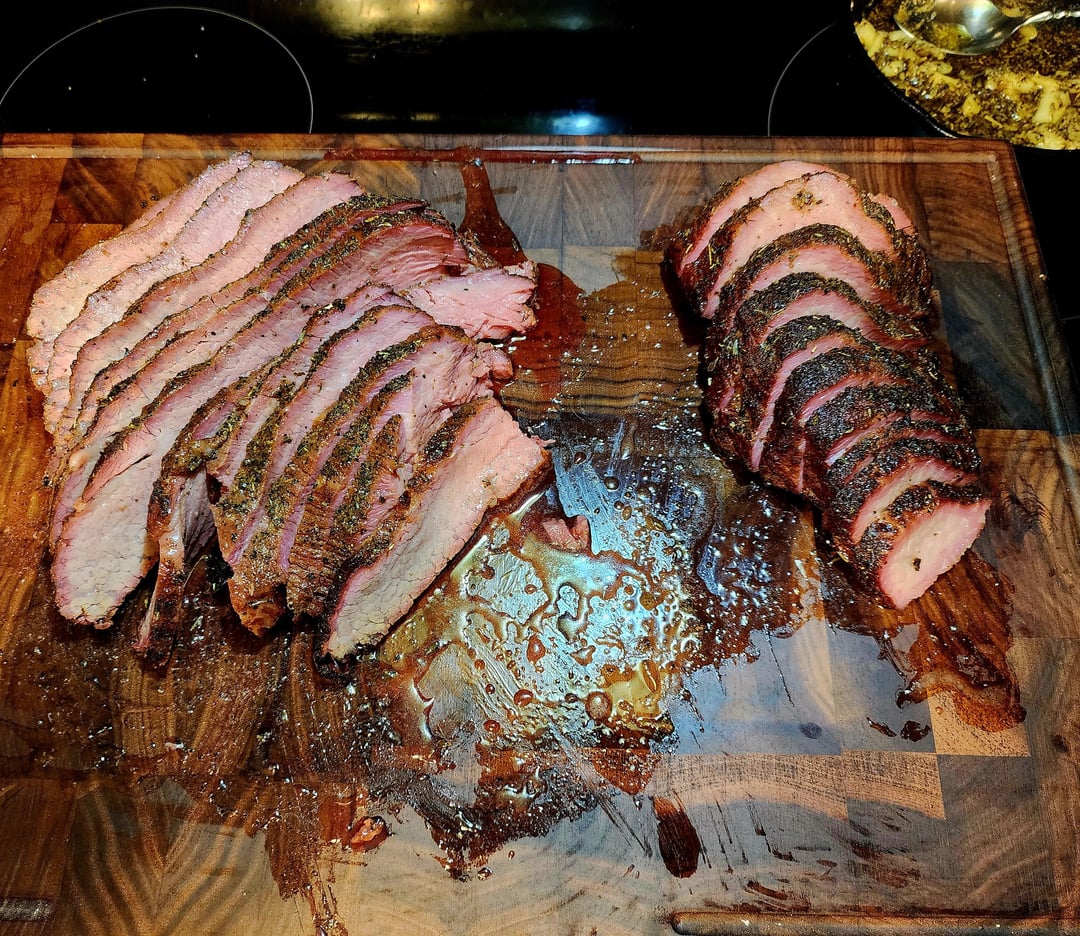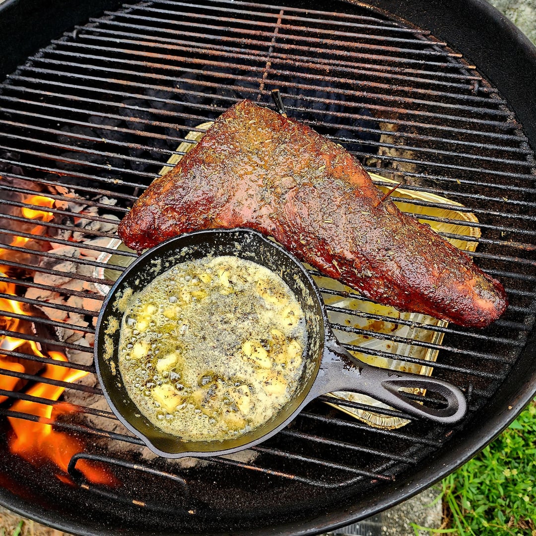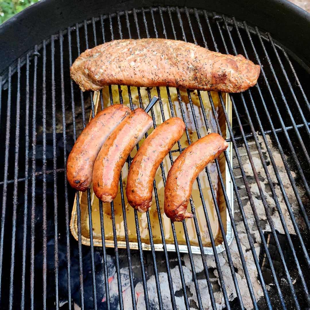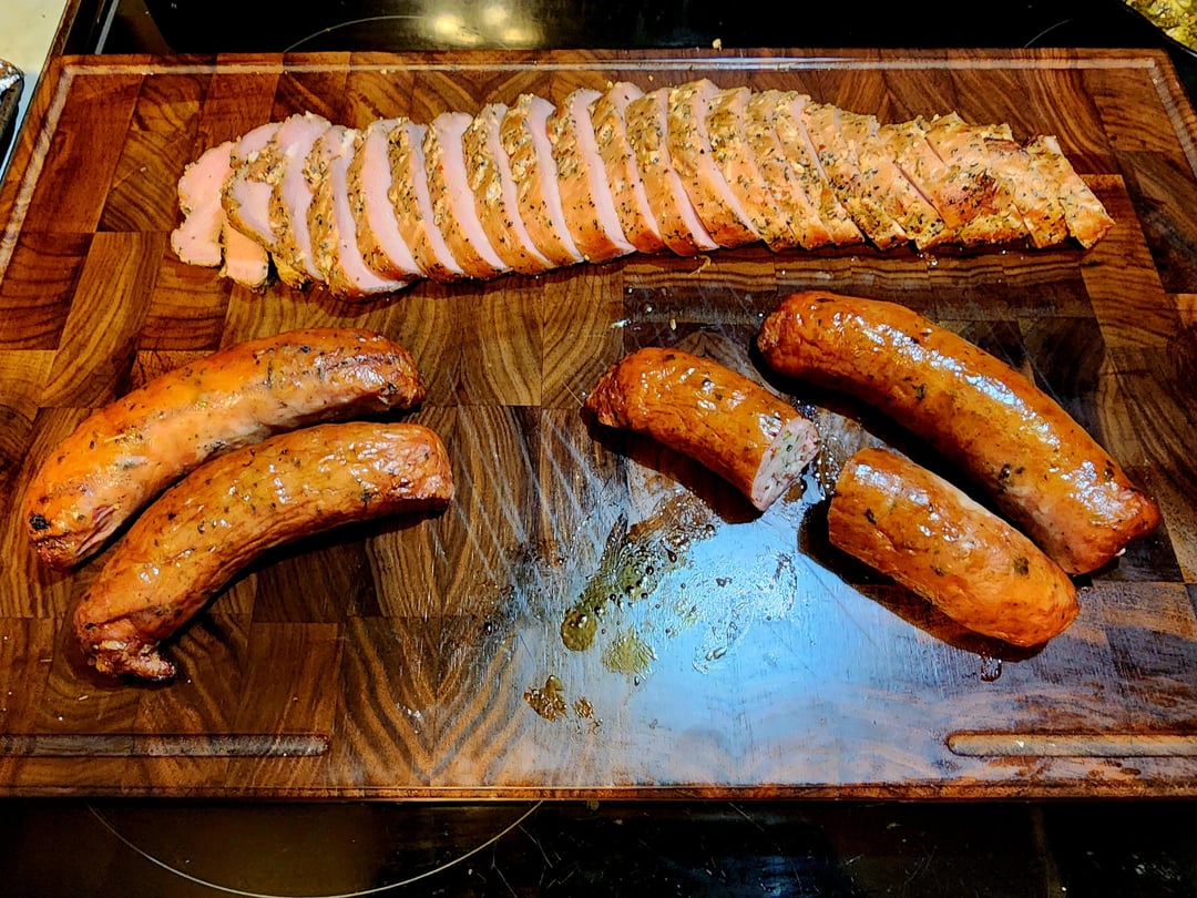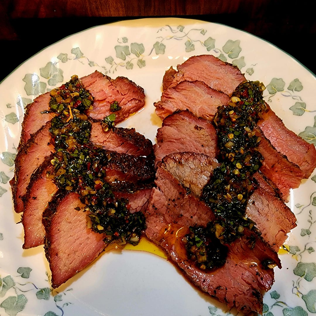 Tri-tip with jalapeño garlic rub and basted in herbes de provedence and smashed garlic butter, topped with fresh chimichurri. Basil mozzarella sausages and garlic cracked pepper marinated pork loin on the same snake, and of course, paying the tax.