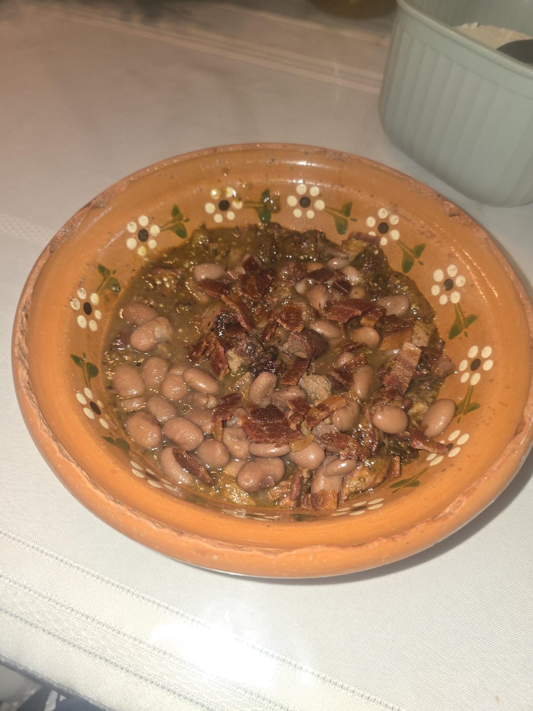 Did some burnt ends and had left overs. Smoked some veggies to make salsa and the smoked some Applewood bacon with cherry wood in the pit boss pro series 4 s2. Make the salsa(typically green salsa) add meat(burnt ends) and cooked beans. Let it simmer, garnish with bacon bits, add crumbly cheese to your taste. Enjoy with homemade tortillas.