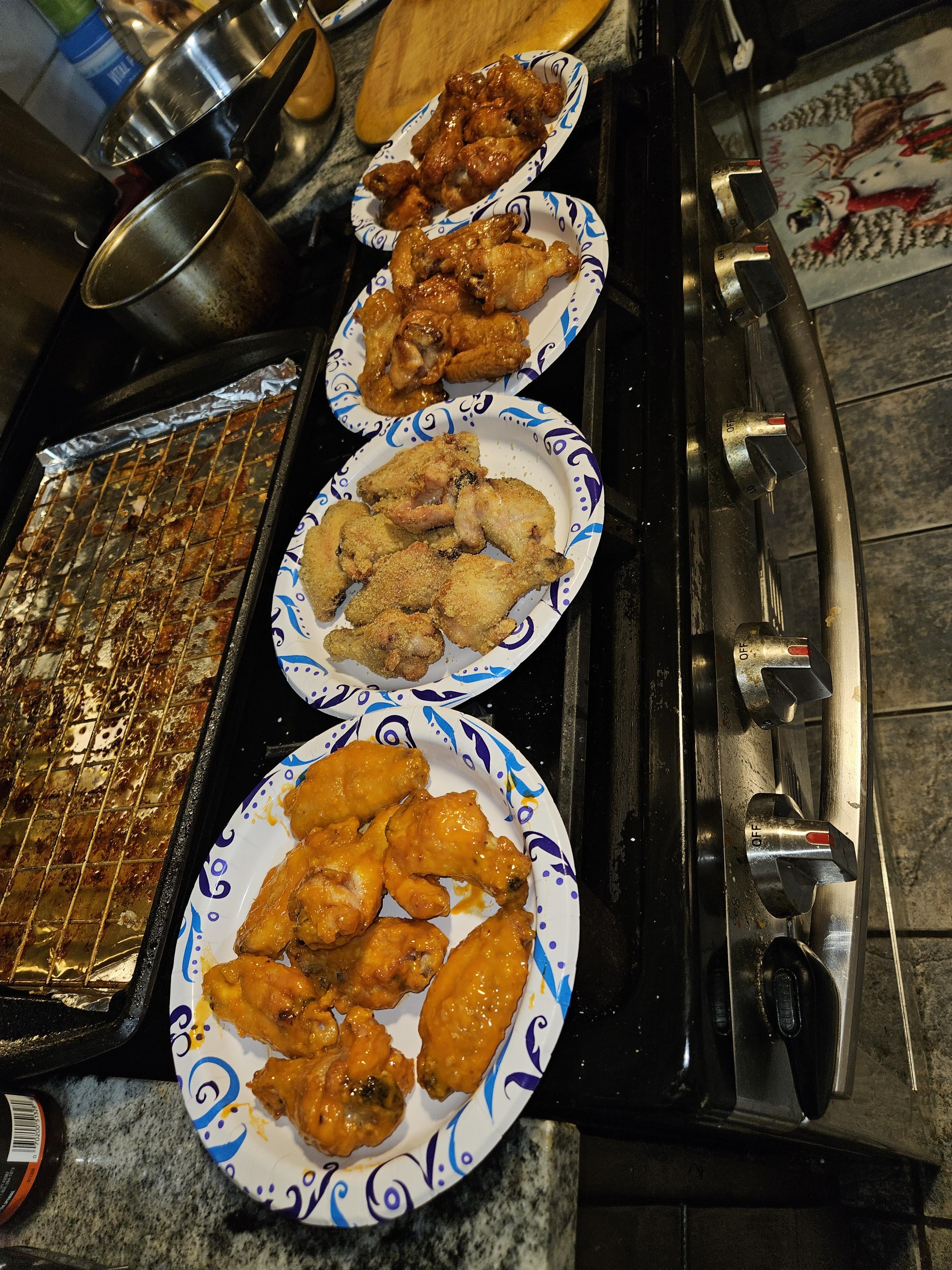 From left to right: Moore's Garlic Buffalo, Salt and Vinegar dry rub, BWW Mango Habanero and a rondom concoction of Kinders Japanese, Melinda's Day of the Dead ghost pepper, and butter. Keep wingin' out there, folks!