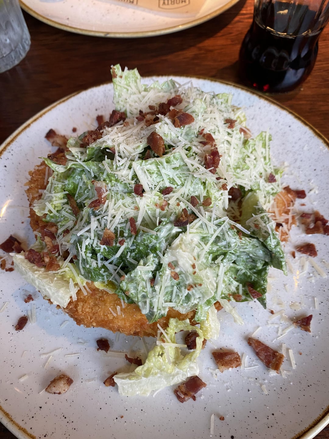 How many calories in this Ceasar salad on top of a (large) chicken schnitzel?