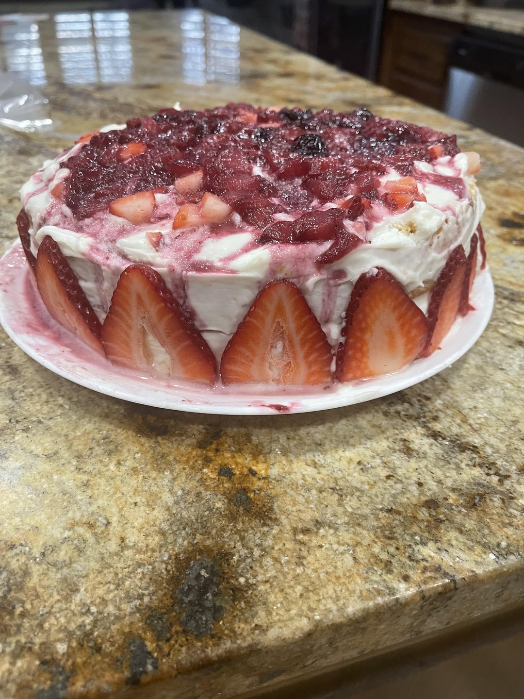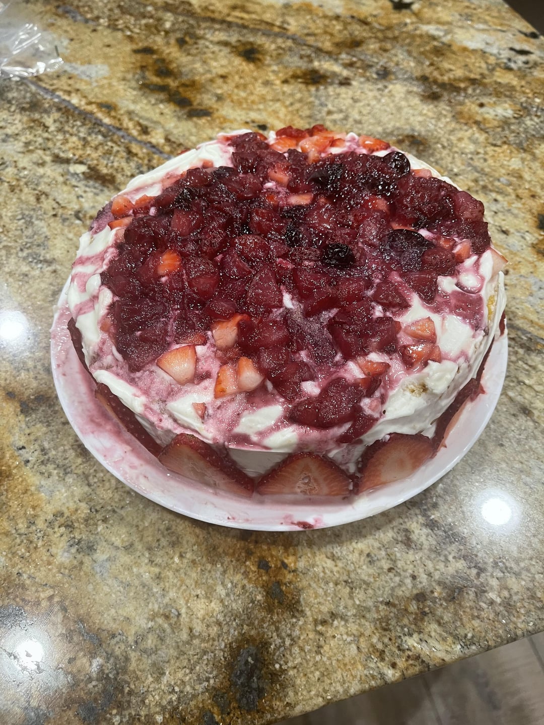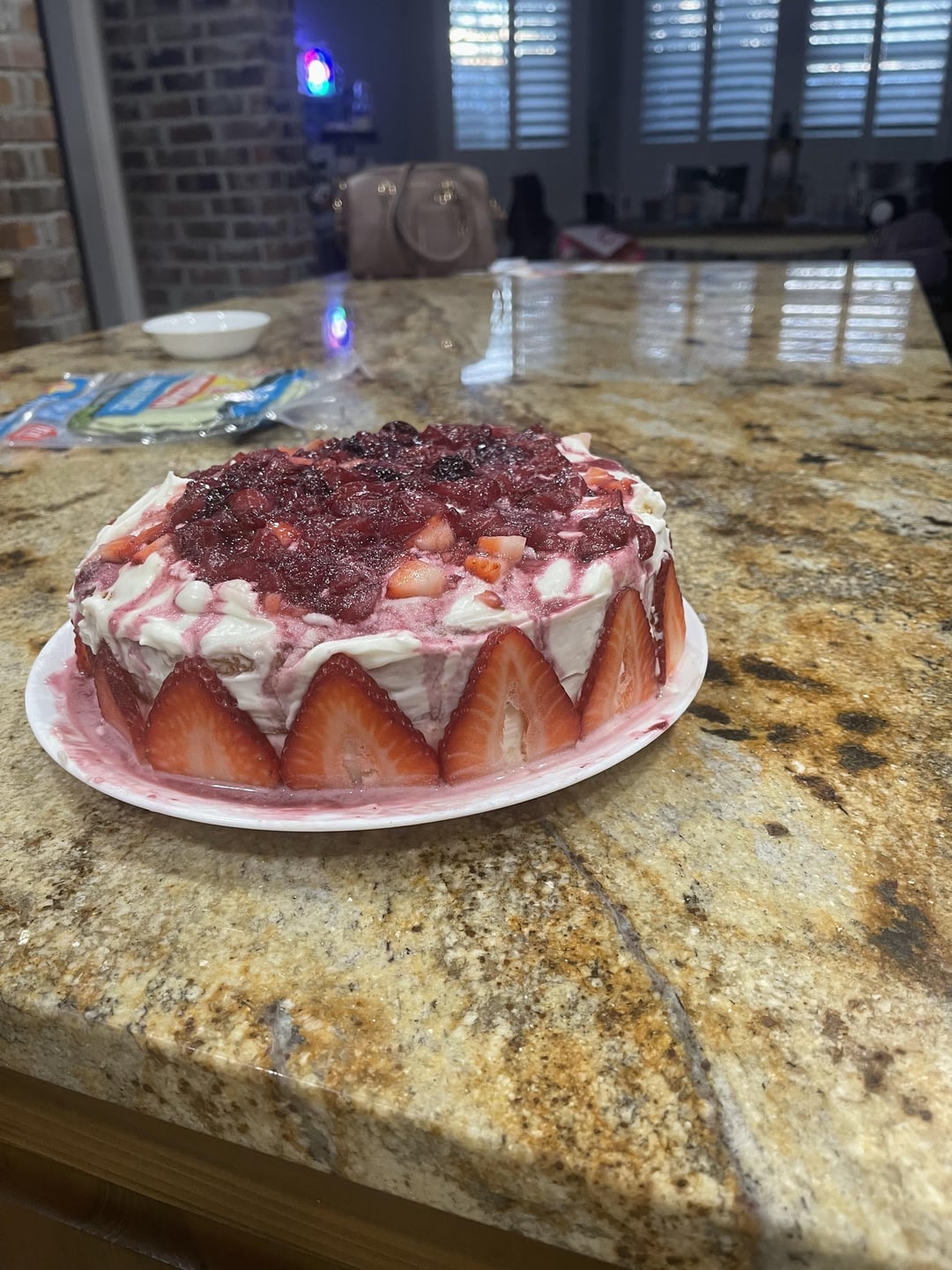 I’ve always baked but never a cake with the intention of making it pretty. My main cake is a praline pecan which doesn’t have a shape lol. So here is my strawberry shortcake cake thing!