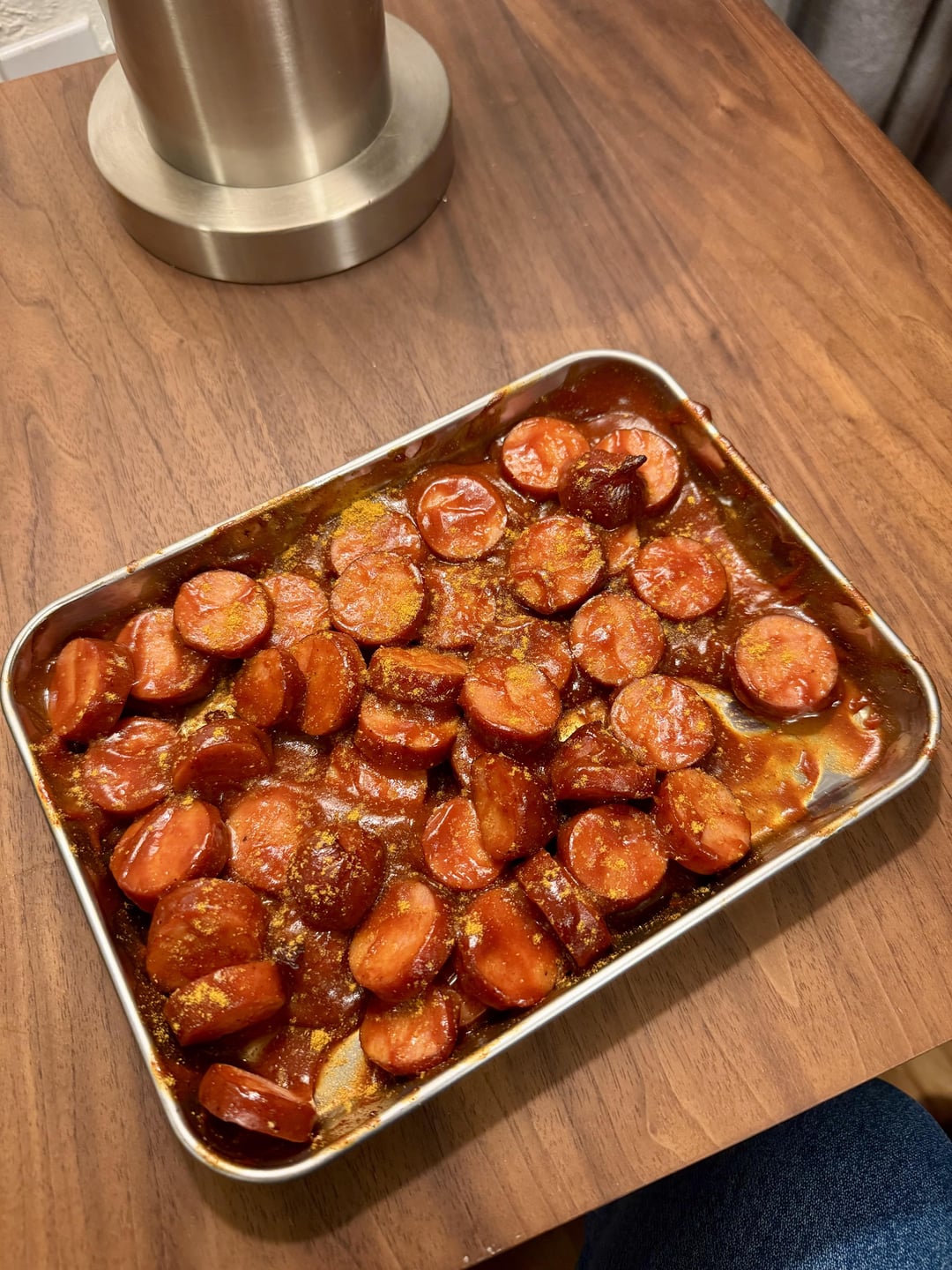 Went to Germany this last summer and have missed the currywurst. Smoked some sausage and made a quick currywurst sauce. Then cut up the sausage with added the sauce and let it set on the smoker for about 20 min. Topped with just a little bit extra curry powder. Turned out really good, highly recommend!