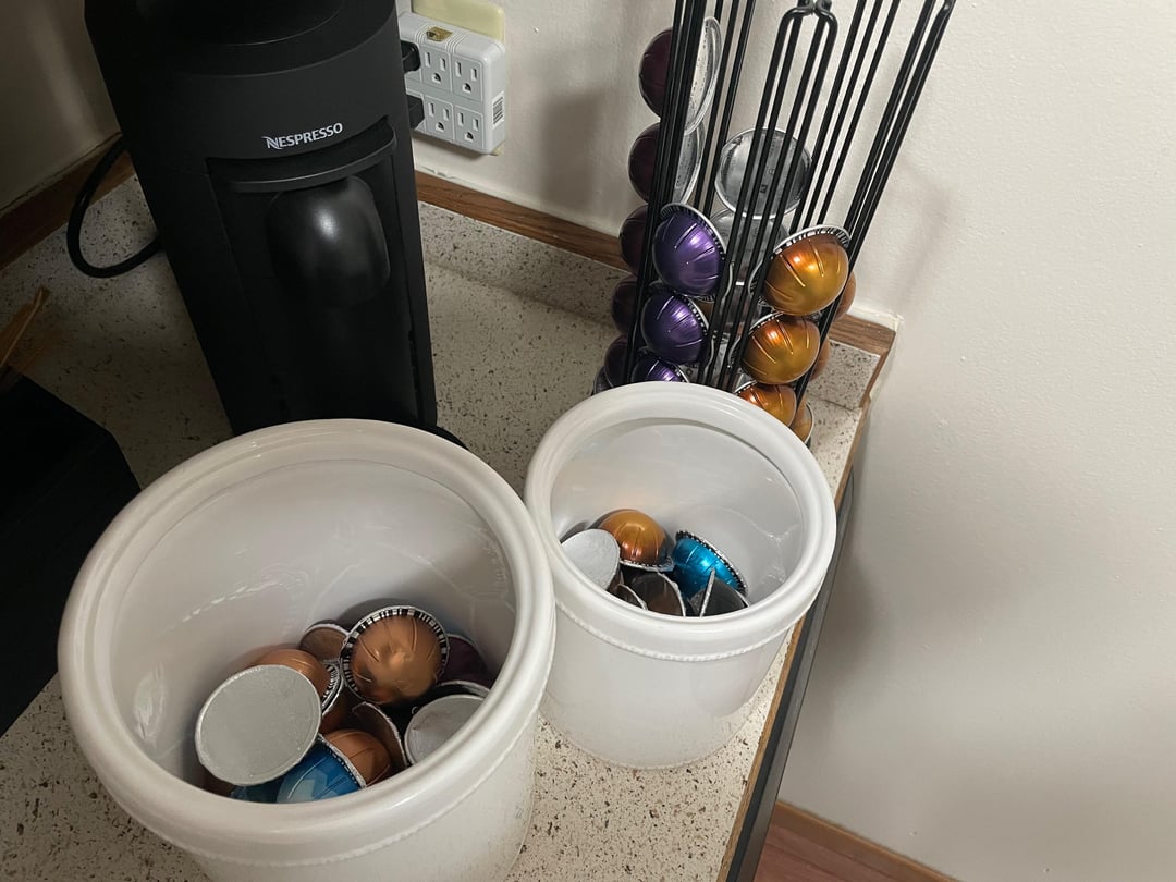 2nd photo pods: The jar on the left is refilled coffee 7.7oz pods and right container is 2.7oz double shots. They are stored on the shelf above our coffee bar. The turnstyle is unused pods of various sizes.