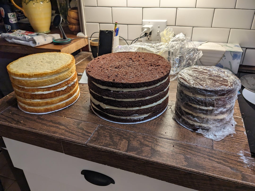 * Chocolate Cake: [https://www.kingarthurbaking.com/recipes/devils-food-cake-recipe](https://www.kingarthurbaking.com/recipes/devils-food-cake-recipe) (scaled to fit 3 10″ pans)
