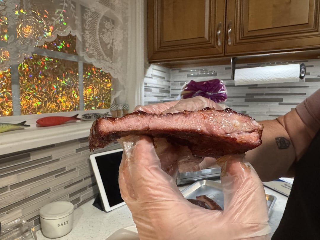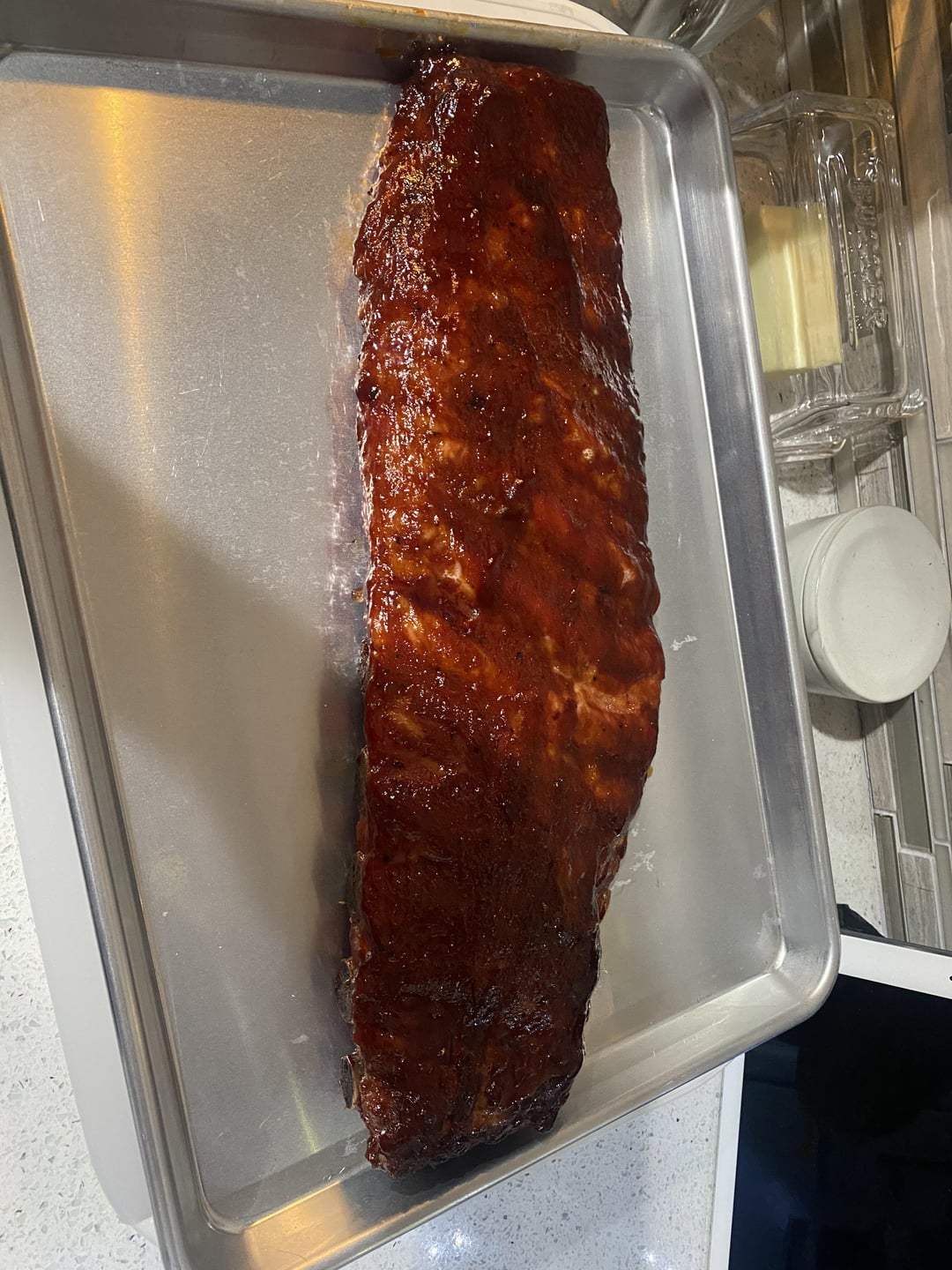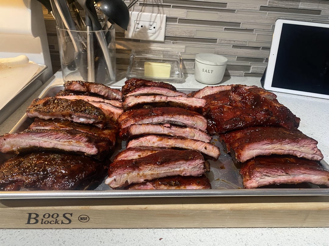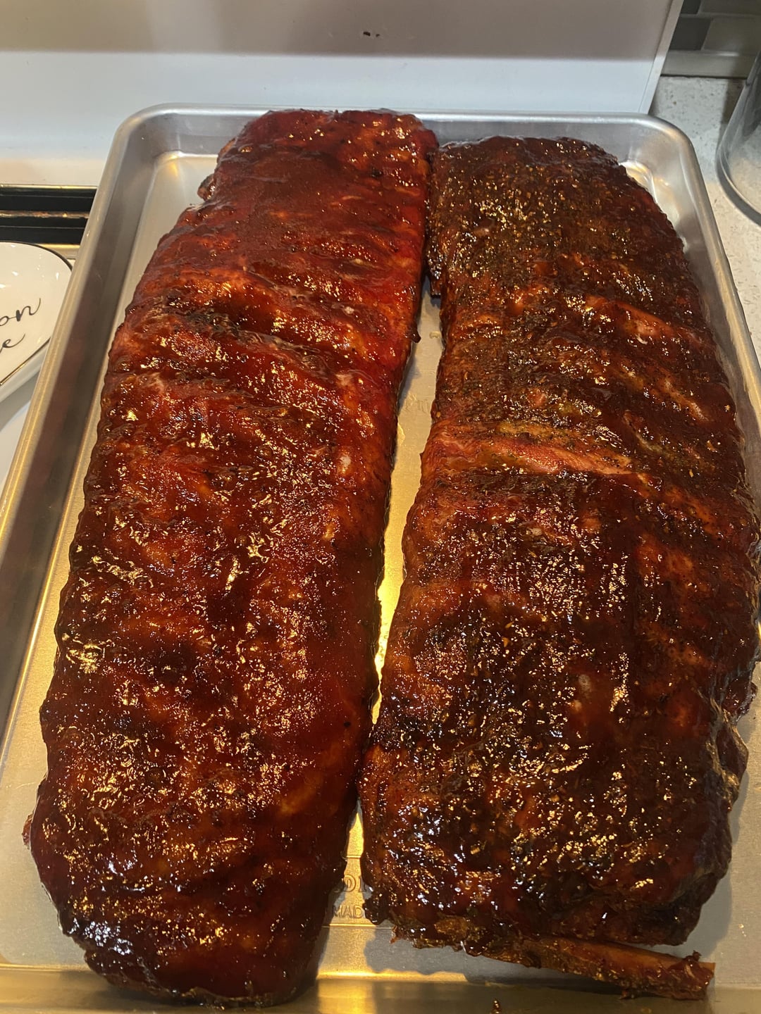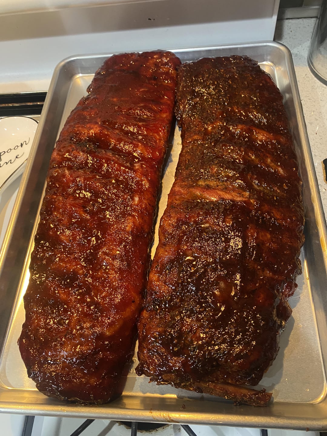Utilized the 321 method with a slight tweak. Smoked at 180 for six hours then at 225!for the last hour while pausing to apply sauce two times. Used Meat Church Honey Hog in combination with Sweet Bay Ray’s Honey Chipotle. Meat Church the Gospel with Kinders Roasted Garlic, and lastly Kinders Cowboy Butter with their Spicy Teriyaki glaze which ended up being my friend’s favorite rack. This is my first time smoking ribs and I couldn’t have been any happier.