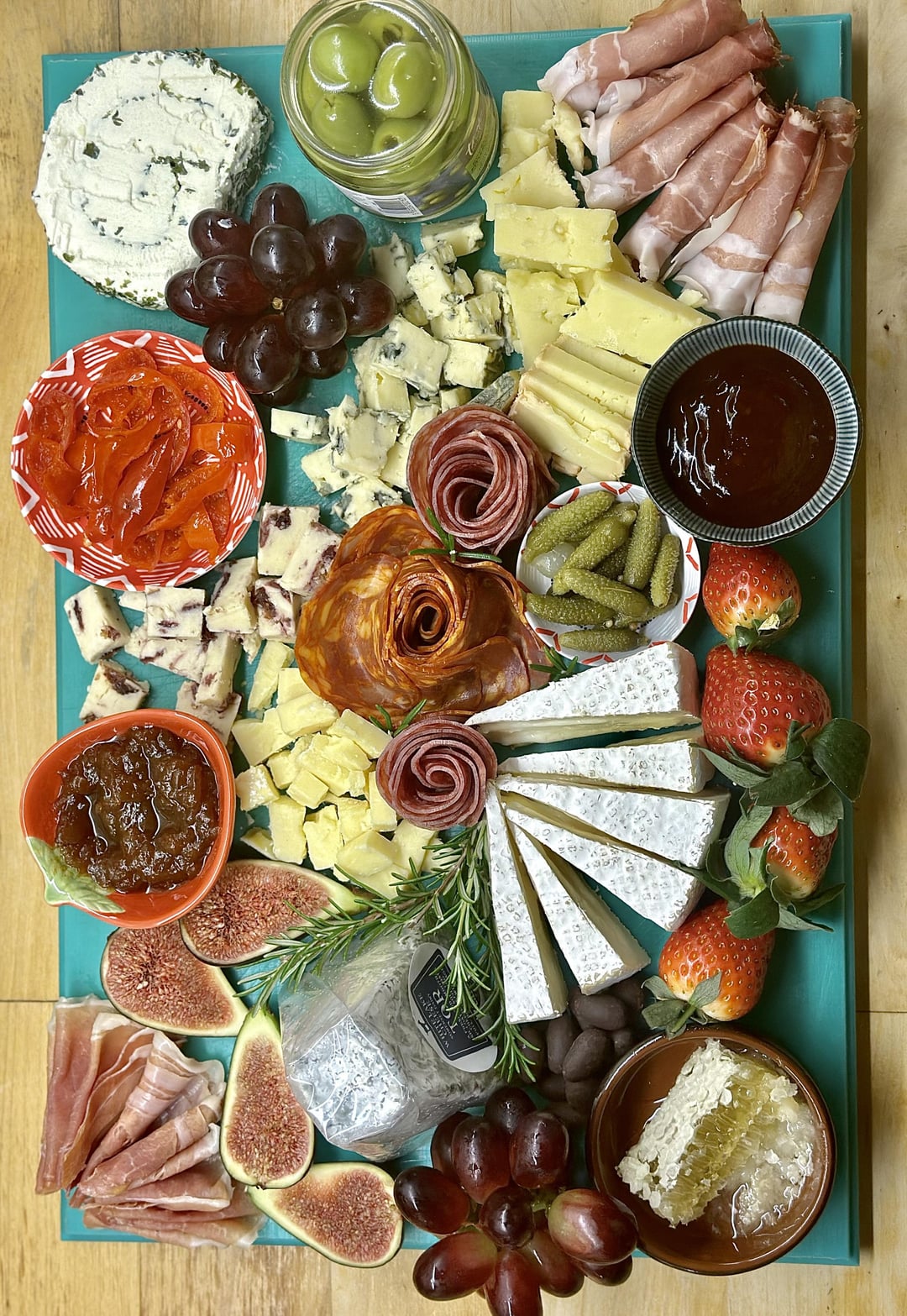 Included are Oxford blue, smoked gubbeen, an English Brie, two cheddars (one with crystals), the goats cheese Tor, a soft cheese with truffles and herbs, wendslaydale and cranberries, fruit, orange chocolate almonds, honeycomb, different meats, pear and something chutney, chilli jam, sweet n spicy peppers and pickles.
