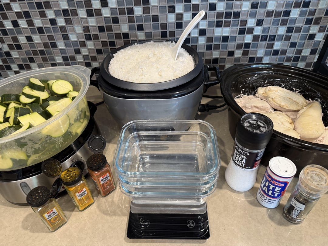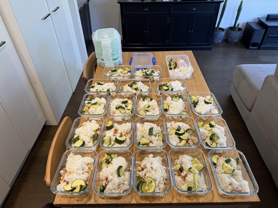 Each container has 130g chicken, 200g jasmine rice, 70g courgette. Seasoned with salt, lite salt, pepper, cumin, paprika and turmeric.